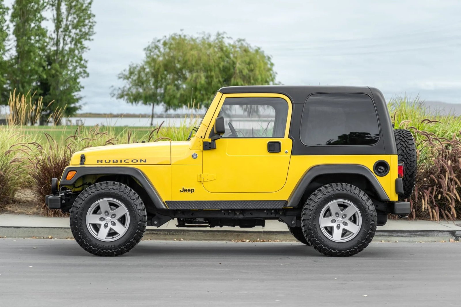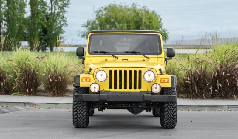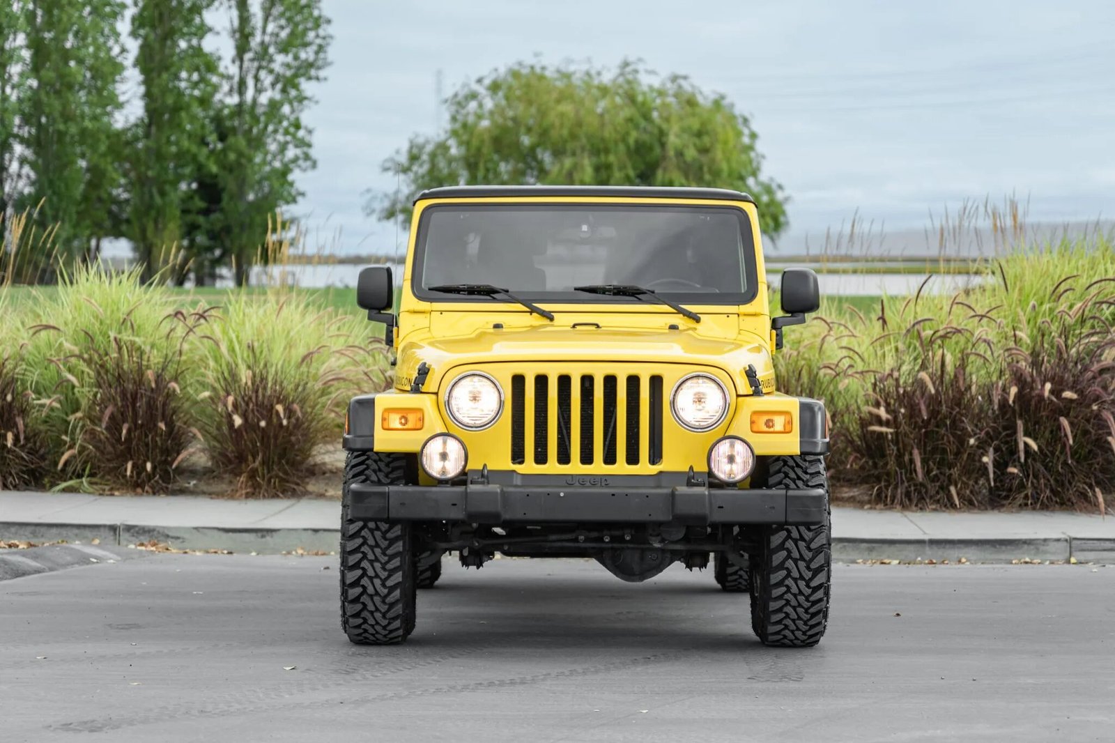 The TJ Wrangler was produced between 1997 and 2006, and this final-year example is finished in Solar Yellow. Equipment includes auxiliary driving lights, black wheel-arch extensions, diamond-plate sill guards, and a black hardtop with tinted glass and a rear wiper.