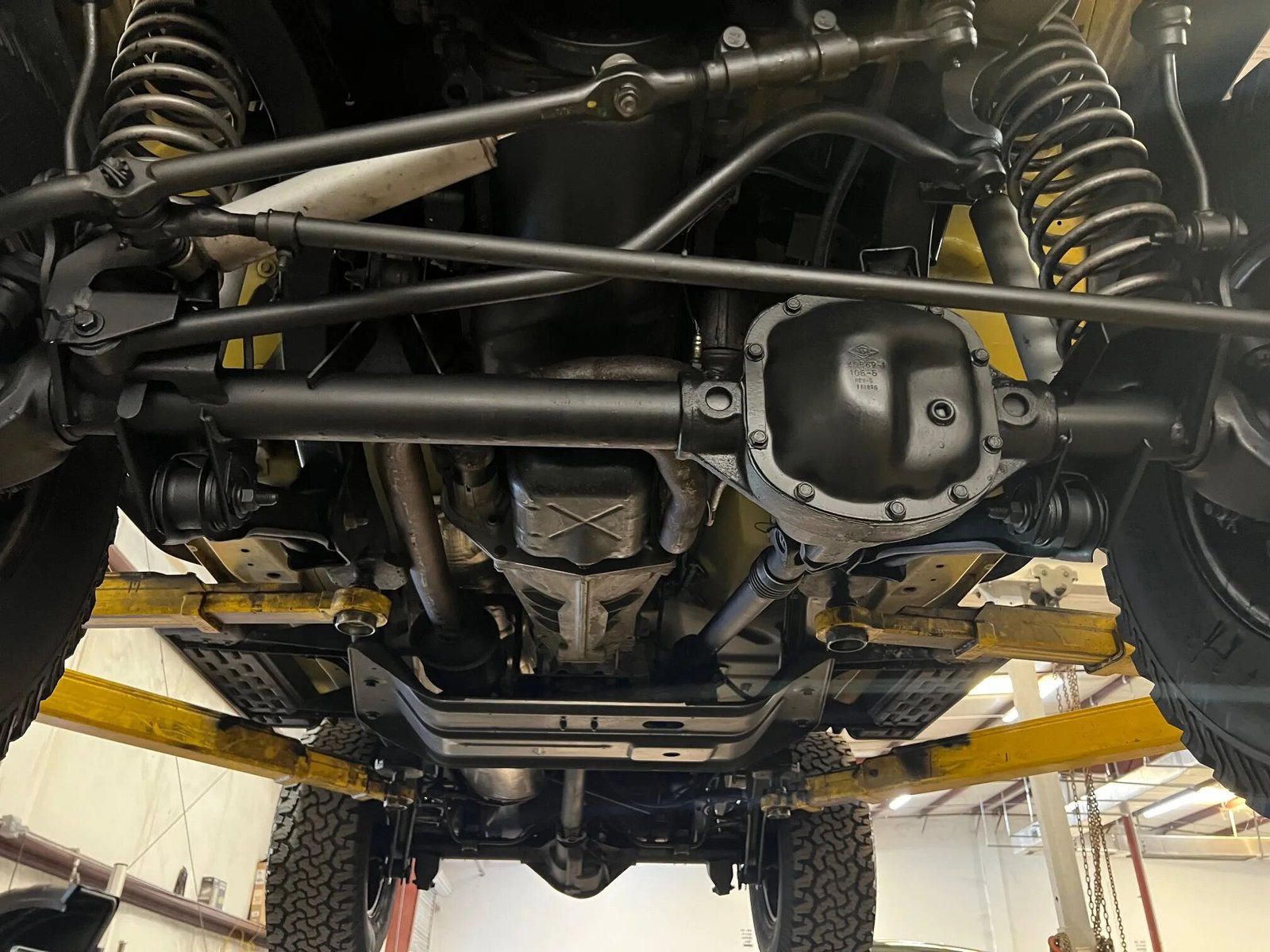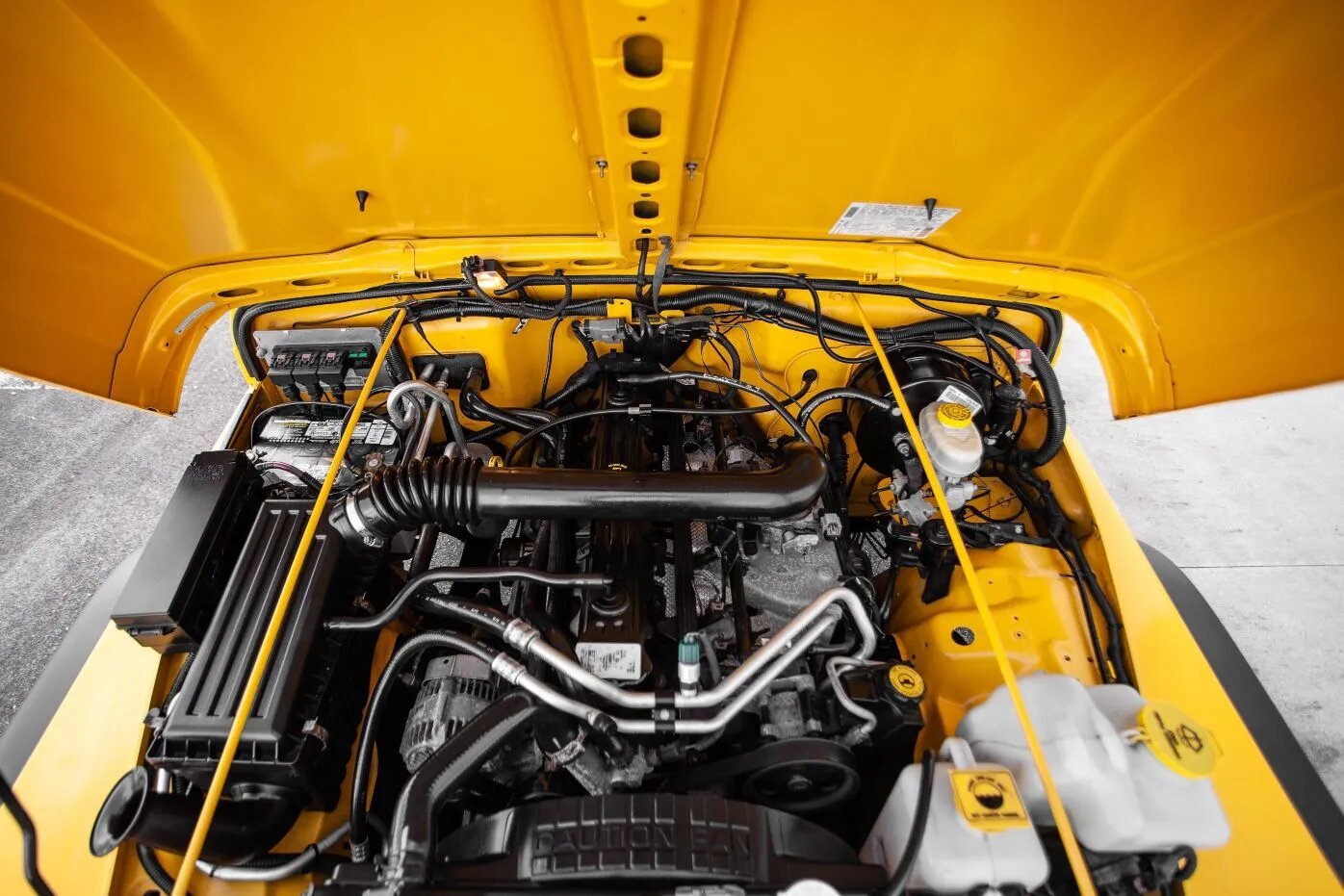 This example is finished in yellow and is equipped with a GR8TOPS Safari removable hardtop, a Warn winch, bumper-mounted KC auxiliary lights, cowl-mounted Warn auxiliary lights, aftermarket hood hold-downs, black fender flares, side steps, a roof rack, a receiver hitch, and a single exhaust outlet.