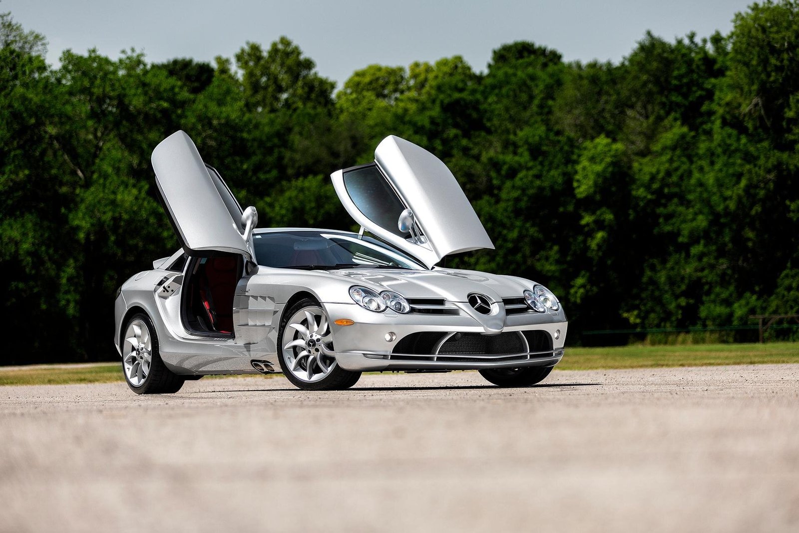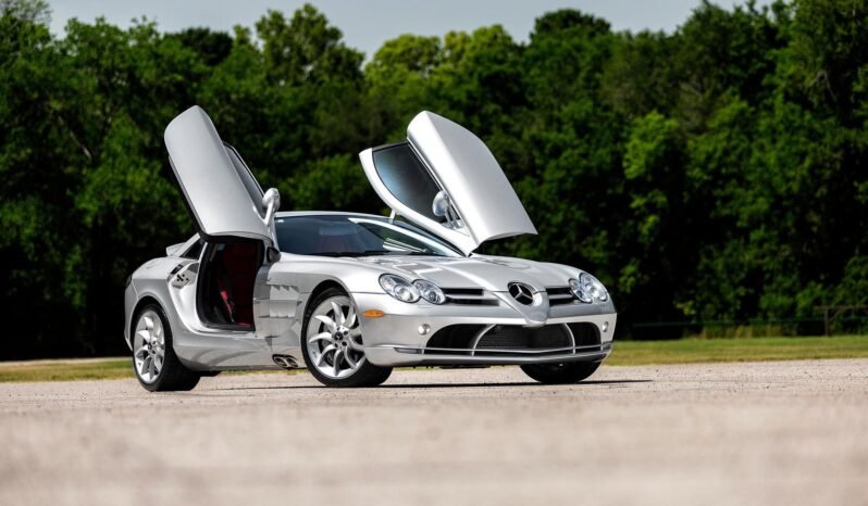 This 2006 Mercedes-Benz SLR McLaren was delivered new to Mercedes-Benz of West Chester, Ohio. The car is finished in Crystal Laurite Silver Metallic over red Silver Arrow 300SL leather upholstery, and power comes from a supercharged 5.4-liter V8 paired with an AMG Speedshift five-speed automatic transmission. Features include butterfly doors, an automatically deploying rear air brake, carbon-ceramic disc brakes, 19” turbine-style wheels, side-exit exhaust pipes, dual-zone automatic climate control, and a factory car phone. The service in preparation for sale included the installation of new fuel tanks and hoses, along with a brake fluid flush and an oil change.