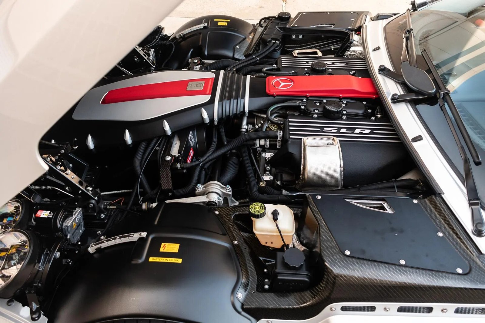 The front-mid-mounted 5.4-liter AMG V8 was factory rated at 617 horsepower and 575 lb-ft of torque and features all-aluminum construction, 24 valves, dry-sump lubrication, and a Lysholm-type twin-screw supercharger.