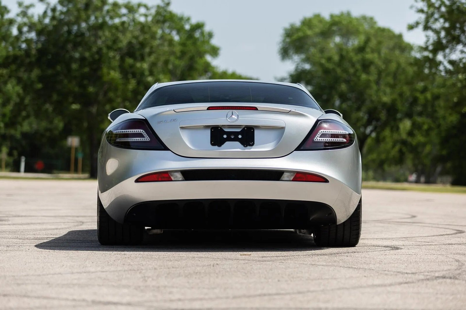The car is finished in Crystal Laurite Silver Metallic (977U) and features an electronically deployed combination spoiler and rear air brake as well as a rear diffuser, upward-opening butterfly doors, and twin side-exhaust outlets behind each front wheel.
