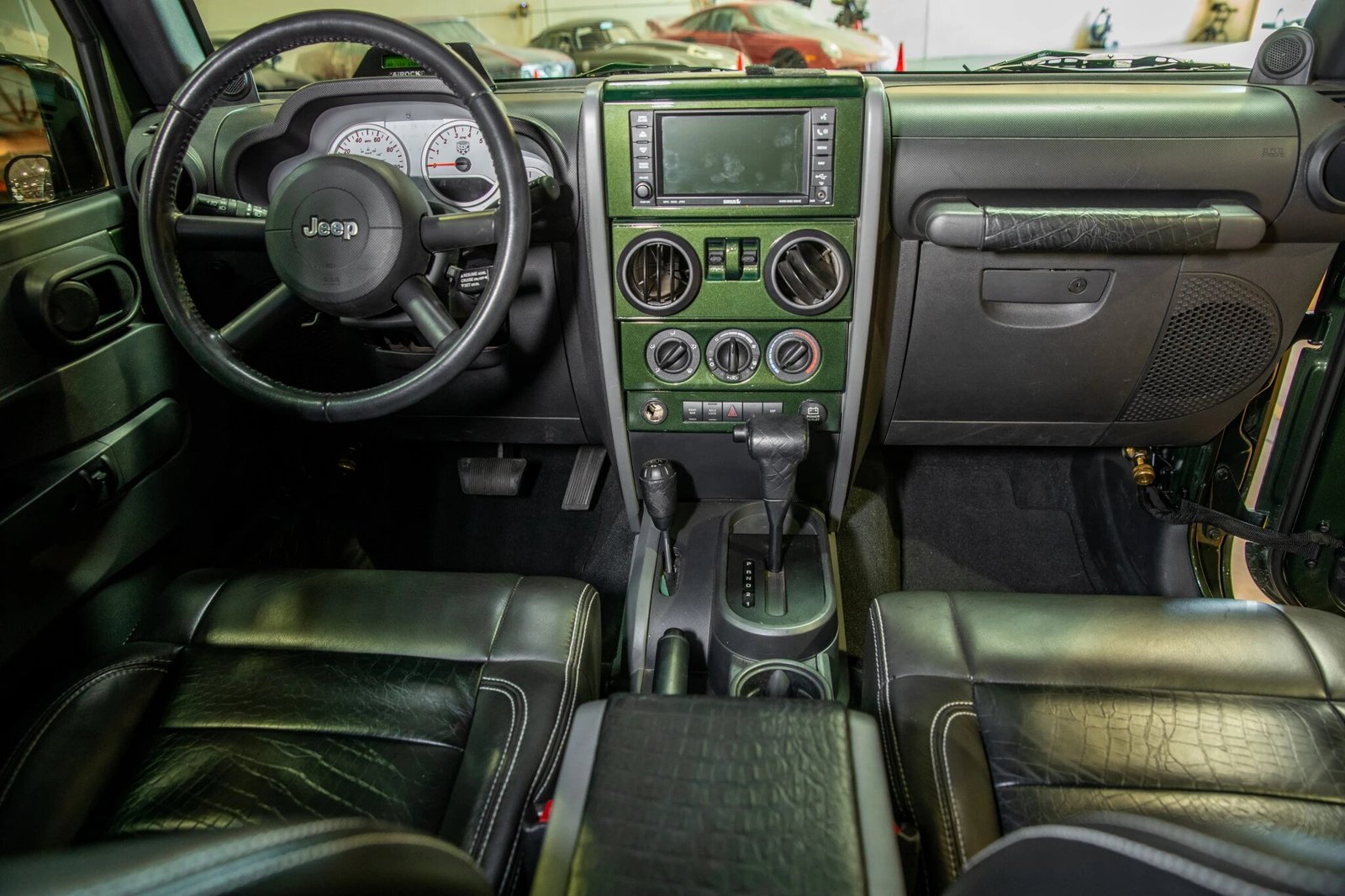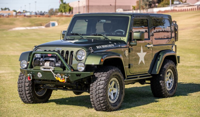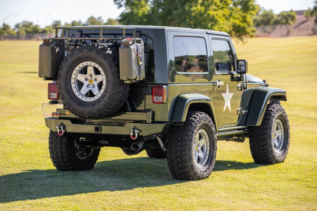 This 2007 Jeep Wrangler Rubicon is a two-door model that was modified by Cop4X4 when new with a 6.1-liter Hemi V8, an AiROCK suspension, a Warn front bumper and winch, body decals, and a rear tire carrier with jerrycans.