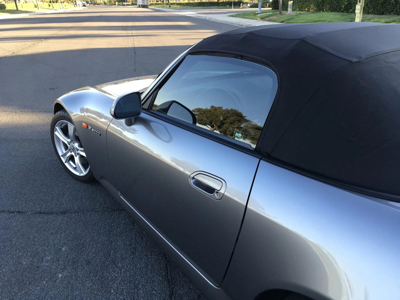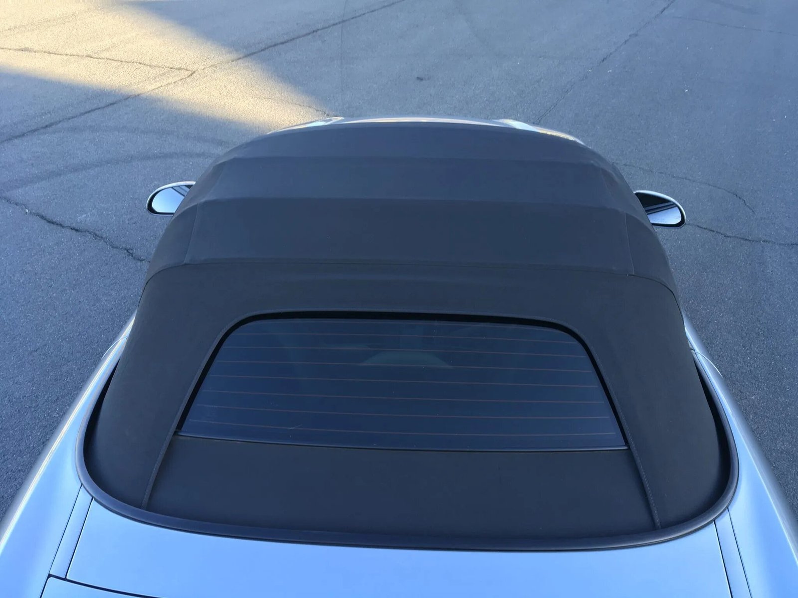 The car is finished in Chicane Silver Metallic and features a power-operated black soft top with a glass rear window. Additional equipment includes xenon headlights, a black windshield surround, roll hoops, a rear spoiler, and oval-tipped exhaust outlets. The right-front inner fender liner was replaced, and paint protection film has been applied to the entire body. Body-color plugs have been installed in the front bumper.