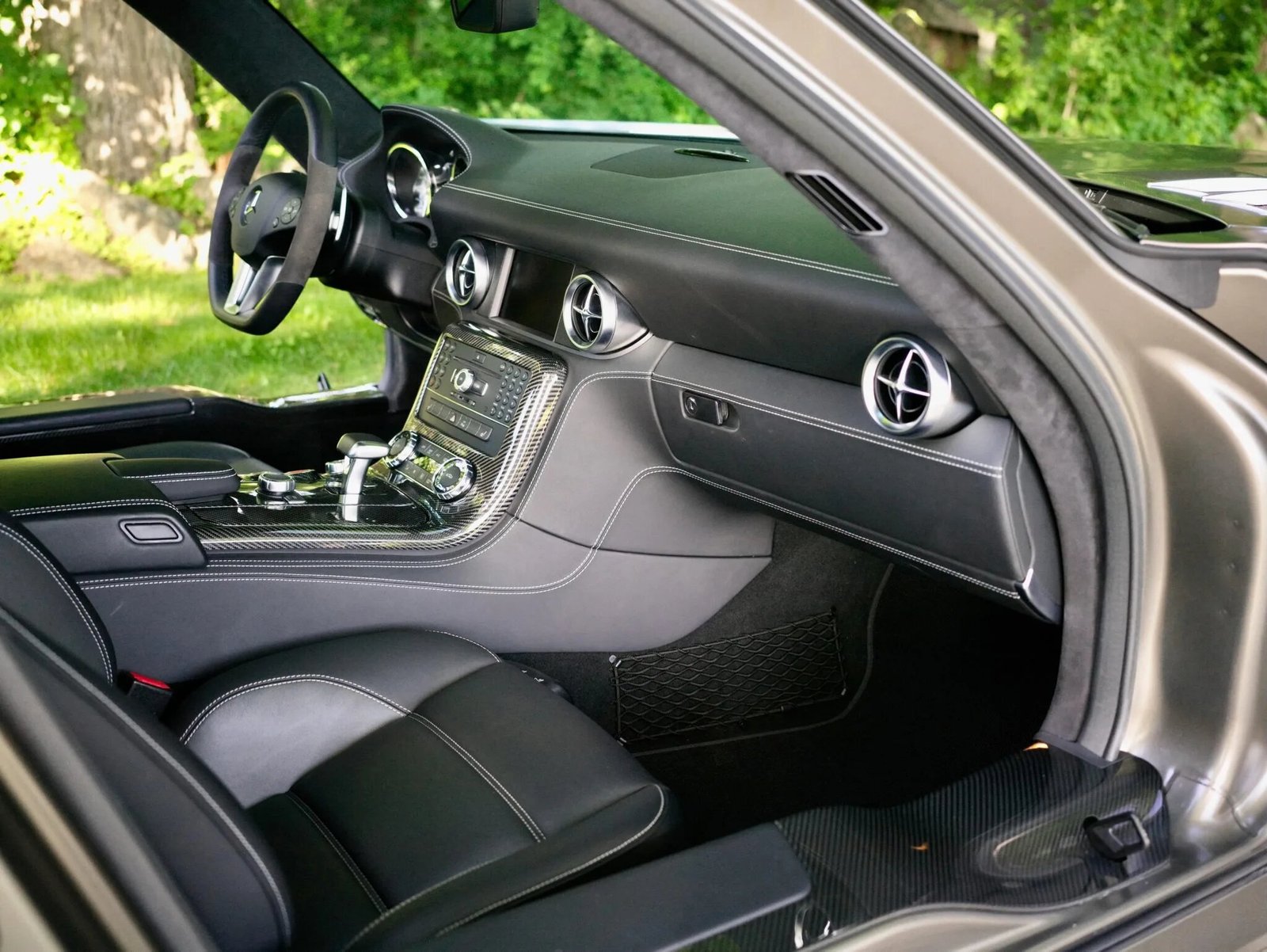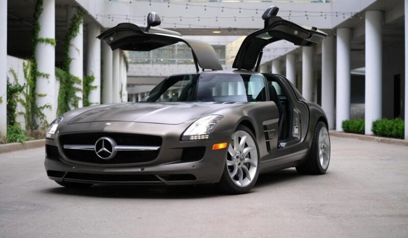 This 2011 Mercedes-Benz SLS AMG is powered by a 6.2-liter V8 mated to a seven-speed dual-clutch automatic transaxle and a limited-slip differential, and it is finished in Designo Monza Grey Magno over black Exclusive leather. Equipment includes 19″ turbine wheels, bi-xenon headlamps, parking sensors, dual-zone automatic climate control, COMAND infotainment with navigation, and carbon-fiber interior trim.