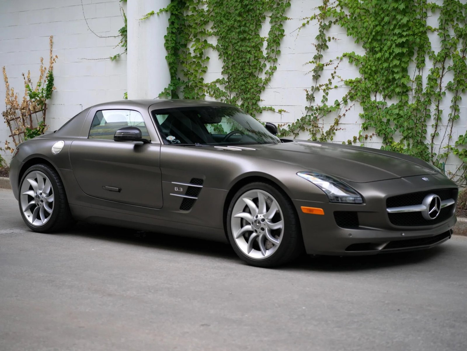 The car is finished in Designo Monza Grey Magno and features gullwing doors, bi-xenon headlamps with washers, carbon-fiber mirror caps, a speed-dependent decklid spoiler, dual exhaust outlets, and front and rear parking sensors.