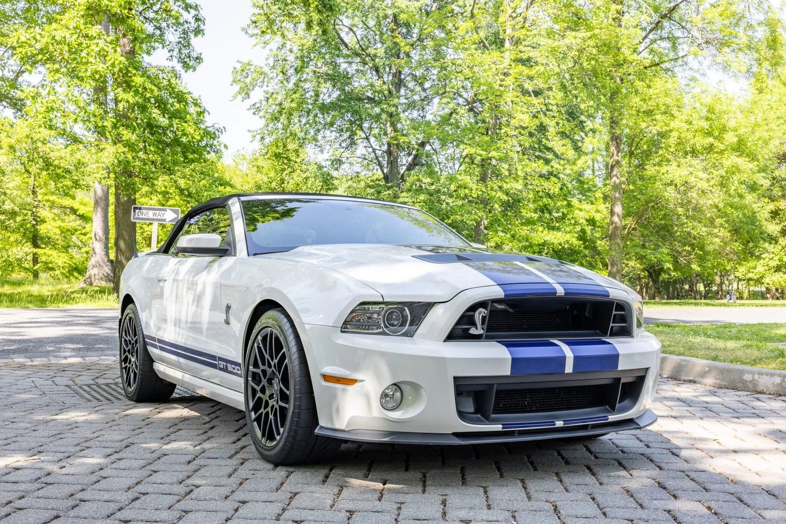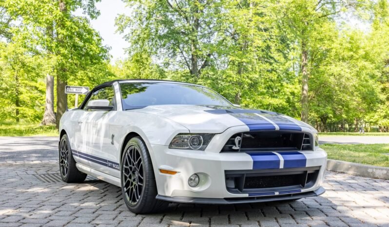 This 2013 Ford Mustang Shelby GT500 convertible is finished in Performance White with blue stripes over black leather upholstery and powered by a supercharged 5.8-liter V8 paired with a six-speed manual transmission. Additional equipment includes a power-operated black soft top, a limited-slip differential, a carbon-fiber driveshaft, staggered-diameter SVT wheels, Brembo front brake calipers, a decklid spoiler, a front splitter, cruise control, Recaro seats, a Shaker Pro audio system, and the Electronics Package with navigation and dual-zone automatic climate control.