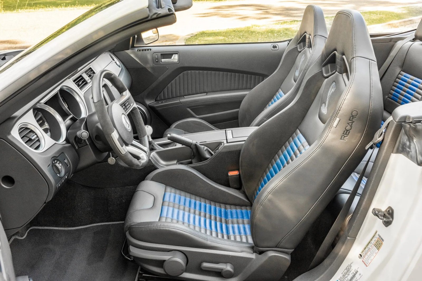 The interior features Recaro front bucket seats upholstered in black leather with blue racing stripe inserts as well as embroidered Cobra logos on the front backrests.