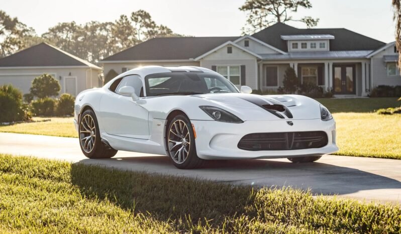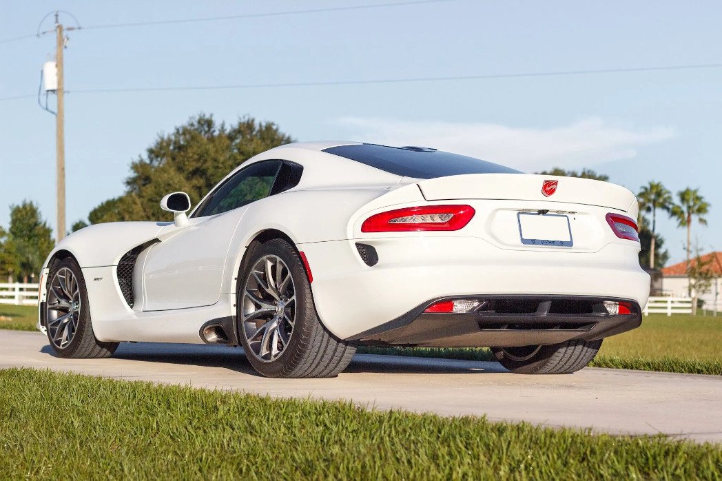 The carbon-fiber and aluminum body is finished in Viper White with black SRT racing stripes and features xenon headlights, an SRT-specific vented hood, a double-bubble roof panel, an illuminating Stryker third brake light, LED taillights, an integrated rear spoiler, and dual side exhaust outlets along with fender and quarter panel vents.
