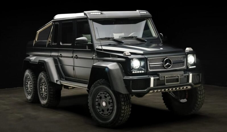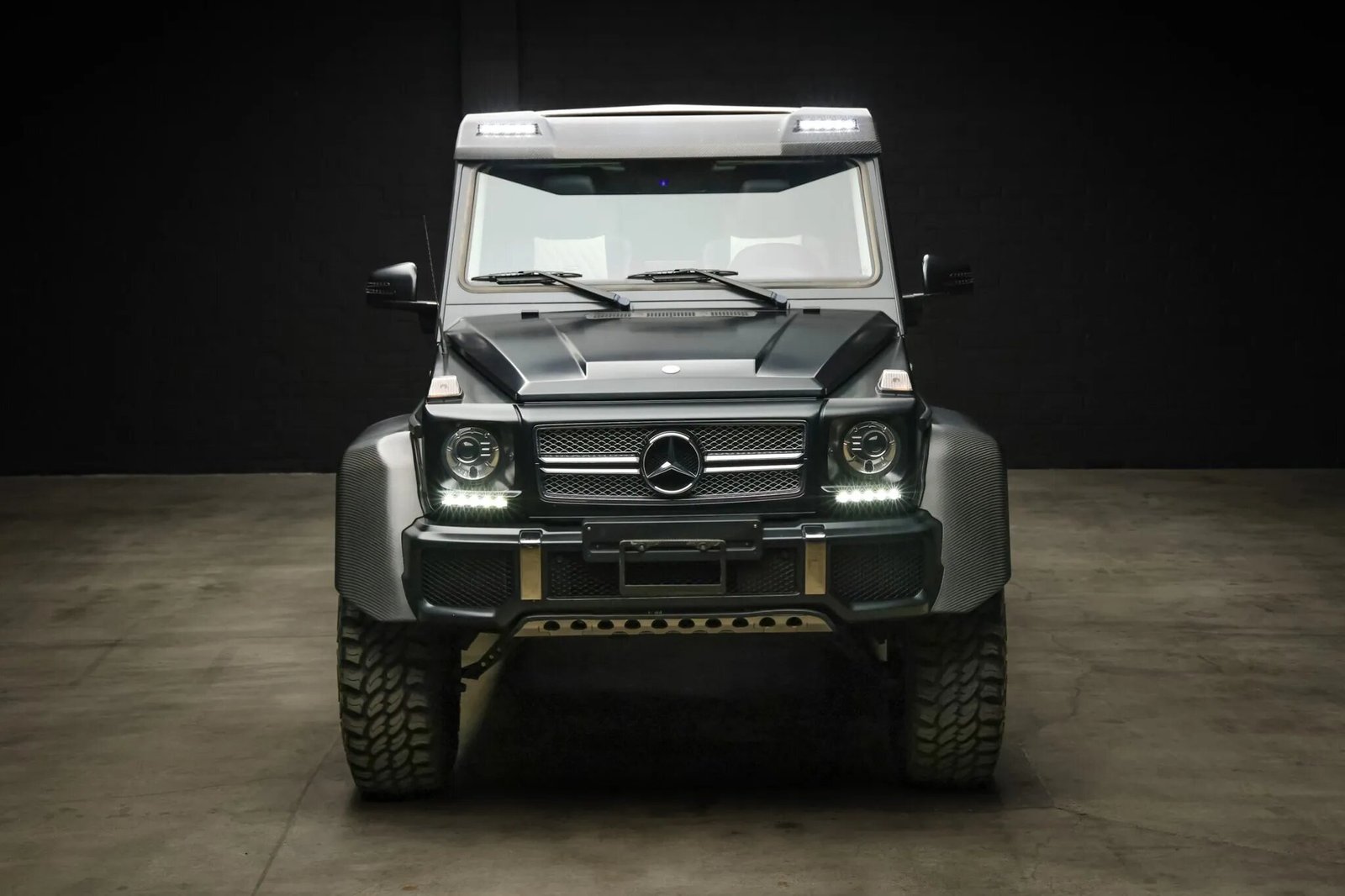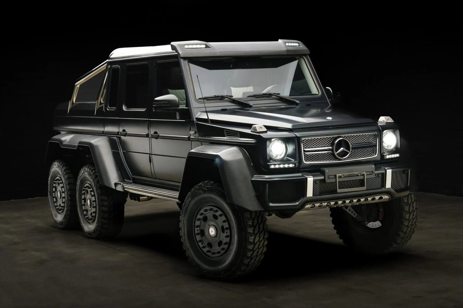 This 2014 Mercedes-Benz G63 AMG 6x6 is one of approximately 100 examples built in Graz, Austria, by Magna Steyr between 2013 and 2015. The truck was imported to the US under a “show or display” exemption in 2014 and was subsequently federalized by G&K Automotive Conversion. The twin-turbocharged 5.5-liter V8 has been modified with Weistec Engineering turbochargers, downpipes, ECU, and exhaust, and power is sent to all six wheels via an AMG Speedshift 7G-Tronic seven-speed automatic transmission, a dual-range transfer case, and five electronic differential locks. The truck is finished in Designo Magno Night Black over a designo black-and-Porcelain quilted leather interior and features bi-xenon headlights, a sunroof, Parktronic, a backup camera, blind-spot monitoring, heated and ventilated power-adjustable front seats, heated rear seats, navigation, a Harman Kardon sound system, Distronic Plus adaptive cruise control, and dual-zone automatic climate control.