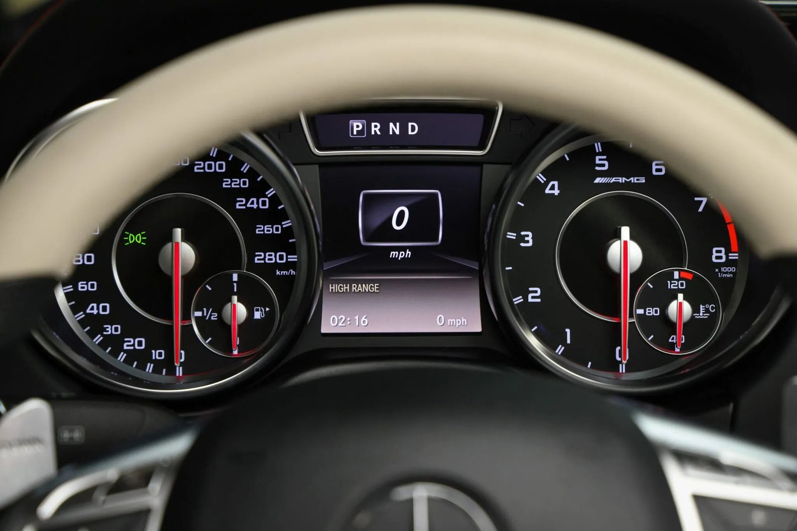 The multi-function steering wheel is wrapped in black perforated leather with Porcelain accents and frames a 280-km/h speedometer, a tachometer, and a color LCD screen along with gauges for fuel level and coolant temperature. Controls for the air compressor system are mounted in the overhead console along with twin Wikai air pressure gauges and a VDO auxiliary fuel level gauge.