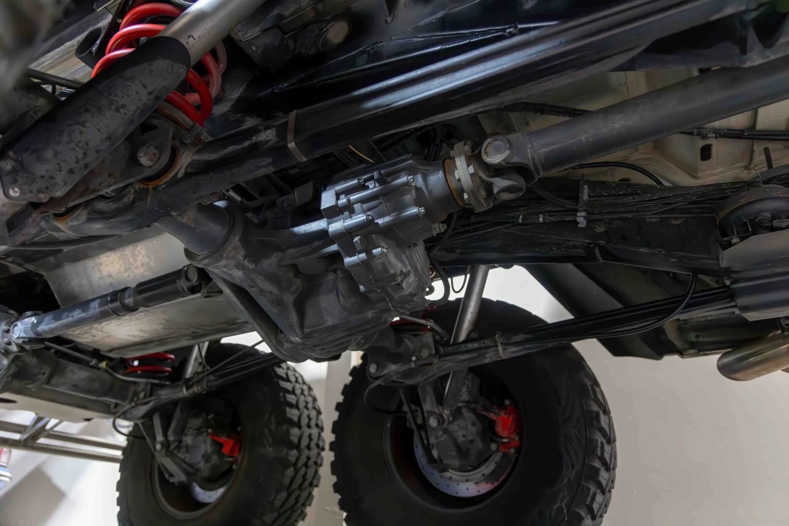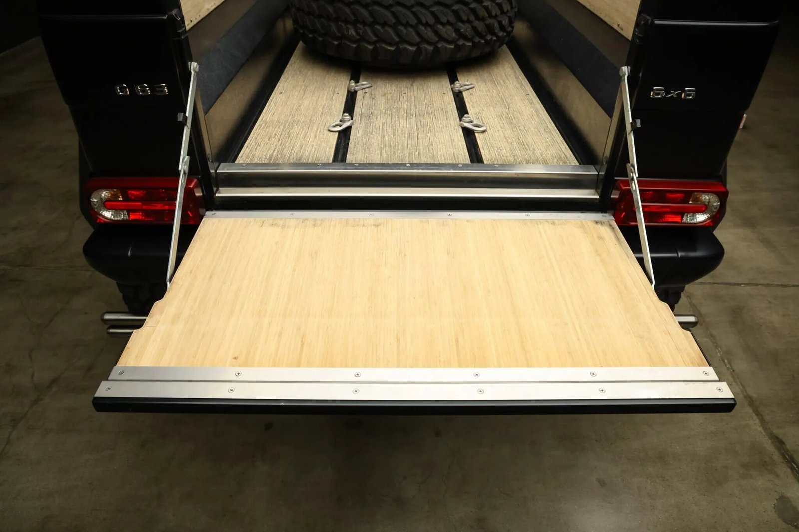 All six 18″ Mercedes-Benz/Hutchinson beadlock wheels feature red accents with Mercedes-Benz center caps and are mounted with 37×12.5″ Pro Comp Extreme MT2 tires. A matching spare wheel is housed in the wood-paneled cargo bed. Braking is handled by cross-drilled Brembo discs at all six wheels.