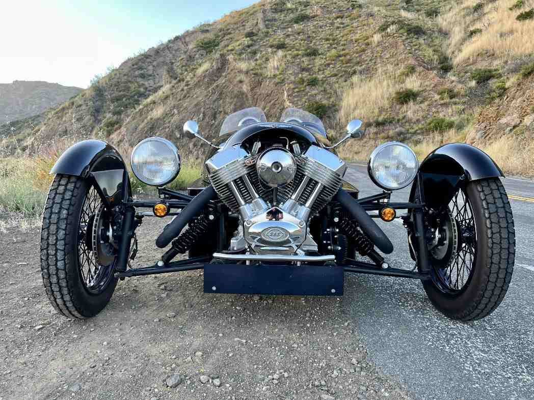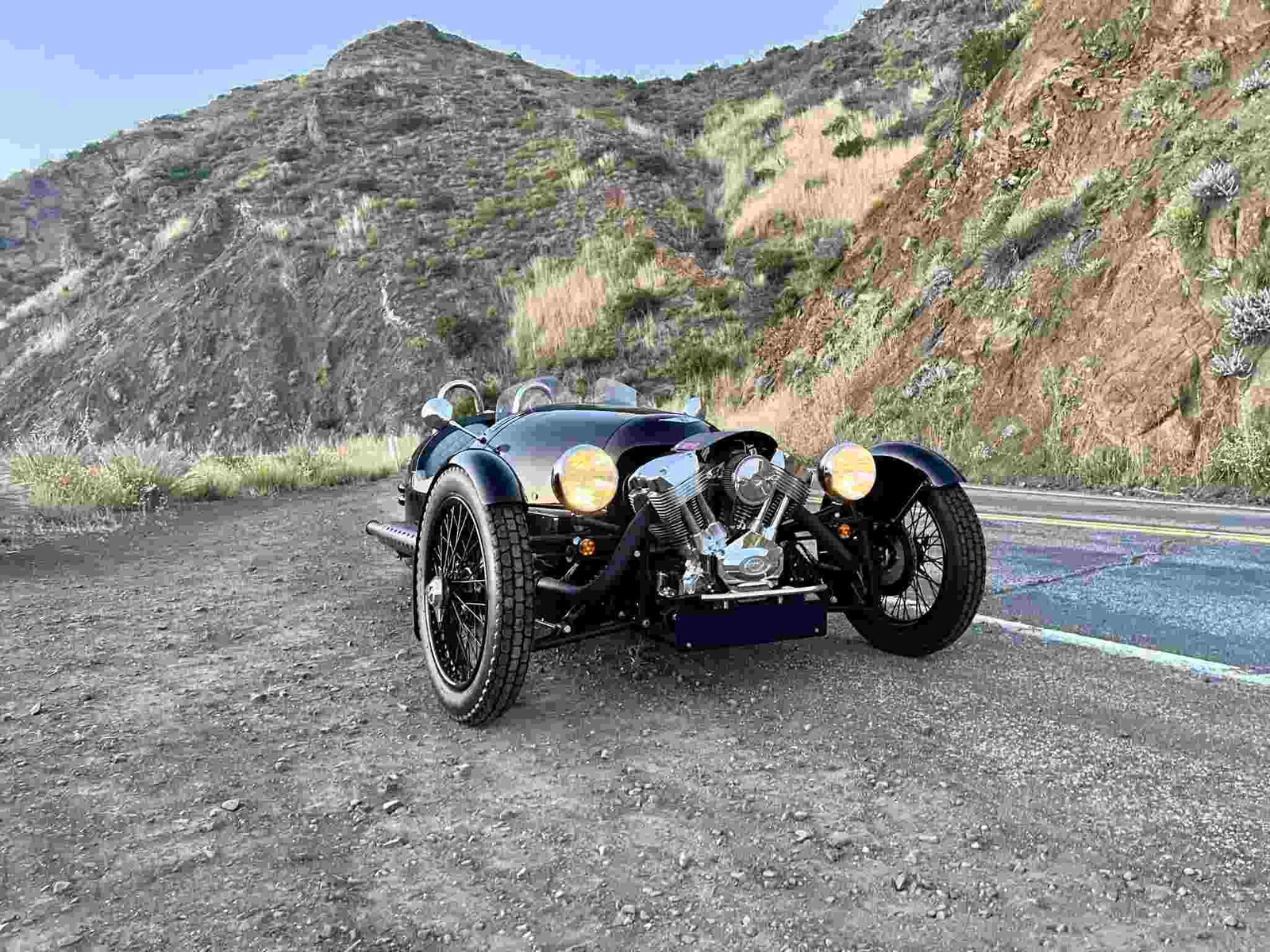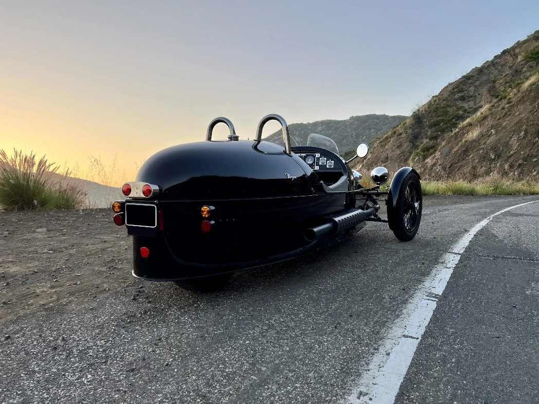 Black front wire wheels wear three-ear knockoffs and are mounted with 4.00-19″ Avon tires, while a single 15″ wheel with a 175/65 Uniroyal tire is positioned under the rear bodywork.