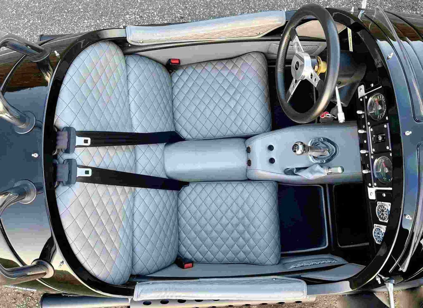 The cabin houses seats upholstered in quilted Yarwood Silver leather and features storage pockets, vintage-style rally timer clocks, and a quick-release custom steering wheel featuring chrome “Morgan” script.
