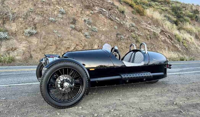 This 2014 Morgan 3-Wheeler is finished in Sport Black over Yarwood Silver leather upholstery and is powered by a 1,983cc X-Wedge V-twin paired with a five-speed manual transmission. Subsequent work included installing adjustable pedals, a quick-release steering wheel, and rally timer clocks as well as powder-coating the exhaust system. Equipment includes 19″ wire-spoke front wheels, dual side pipes, chrome roll hoops, and storage pockets.
