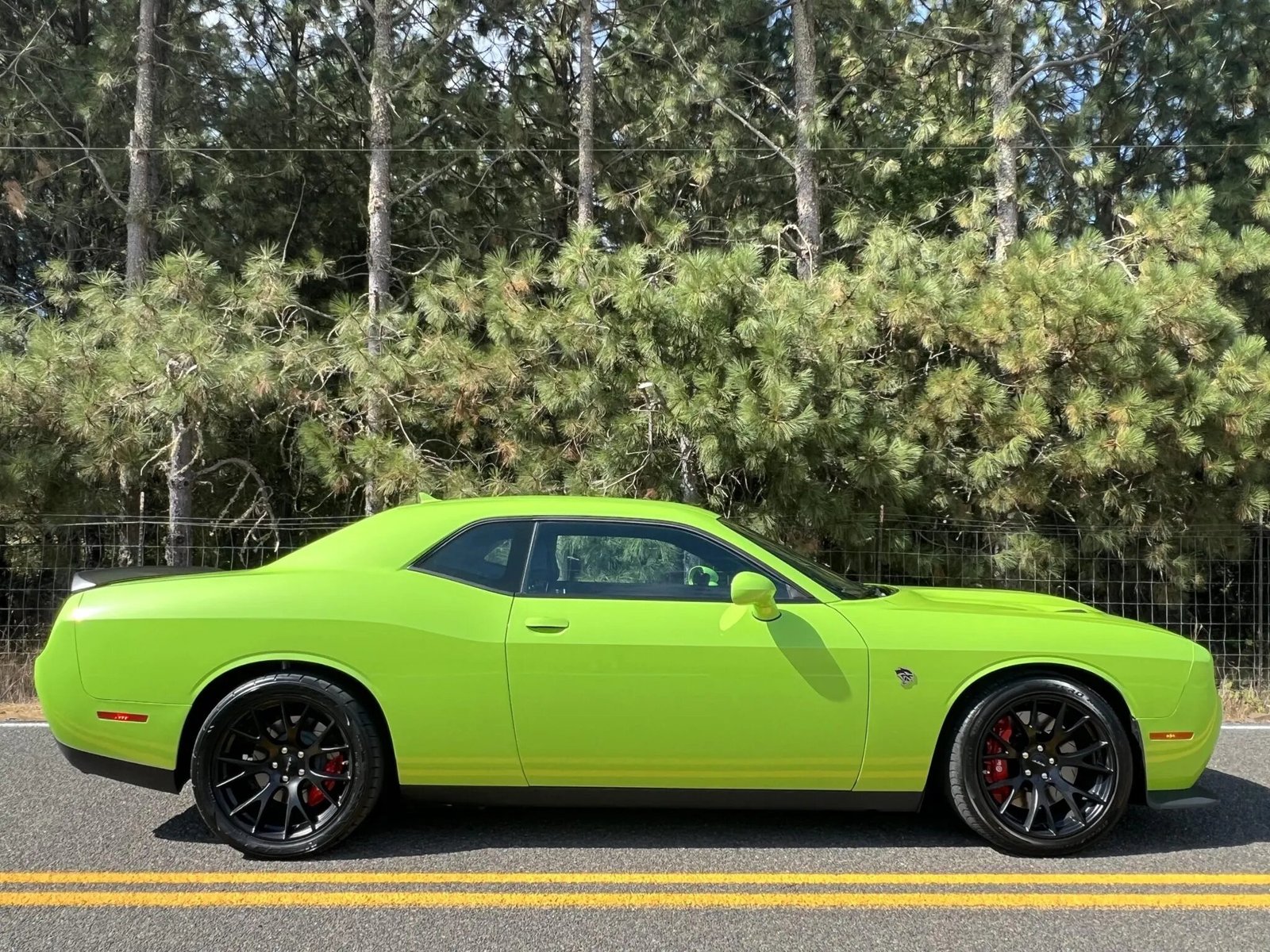 The car is finished in Sublime Green Pearl Coat with satin black front and rear spoilers. Additional exterior features include HID headlamps, LED taillights, a functional hood scoop, Hellcat fender badges, a backup camera, and dual exhaust outlets finished in Black Vapor chrome.