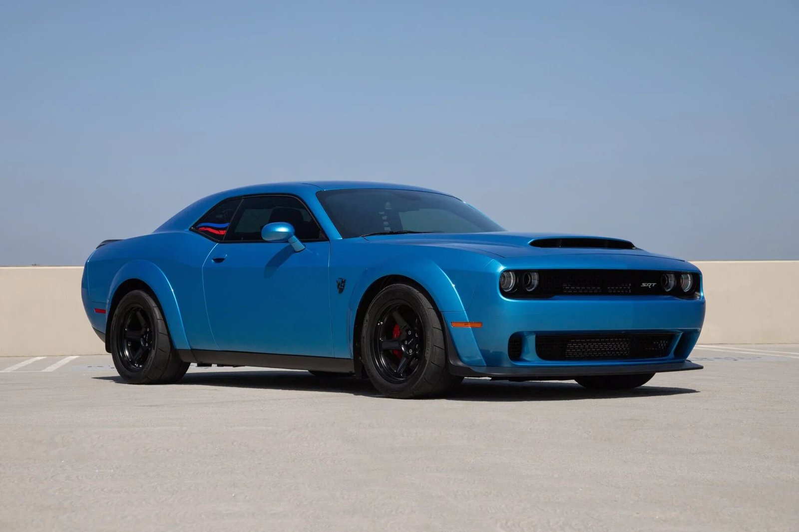 This 2018 Dodge Challenger SRT Demon is one of 3,300 examples built for the model year. The car is finished in B5 Blue Pearl over a black Laguna leather and Alcantara interior and is powered by a supercharged 6.2-liter Hemi V8 mated to an eight-speed automatic transmission and a limited-slip differential. Equipment includes the Comfort Audio Group, 18″ aluminum wheels, Brembo brakes, an Air-Grabber hood, Uconnect navigation with an 8.4″ display, an 18-speaker Harman Kardon sound system, red seat belts, heated and ventilated front seats, and an optional rear seat.