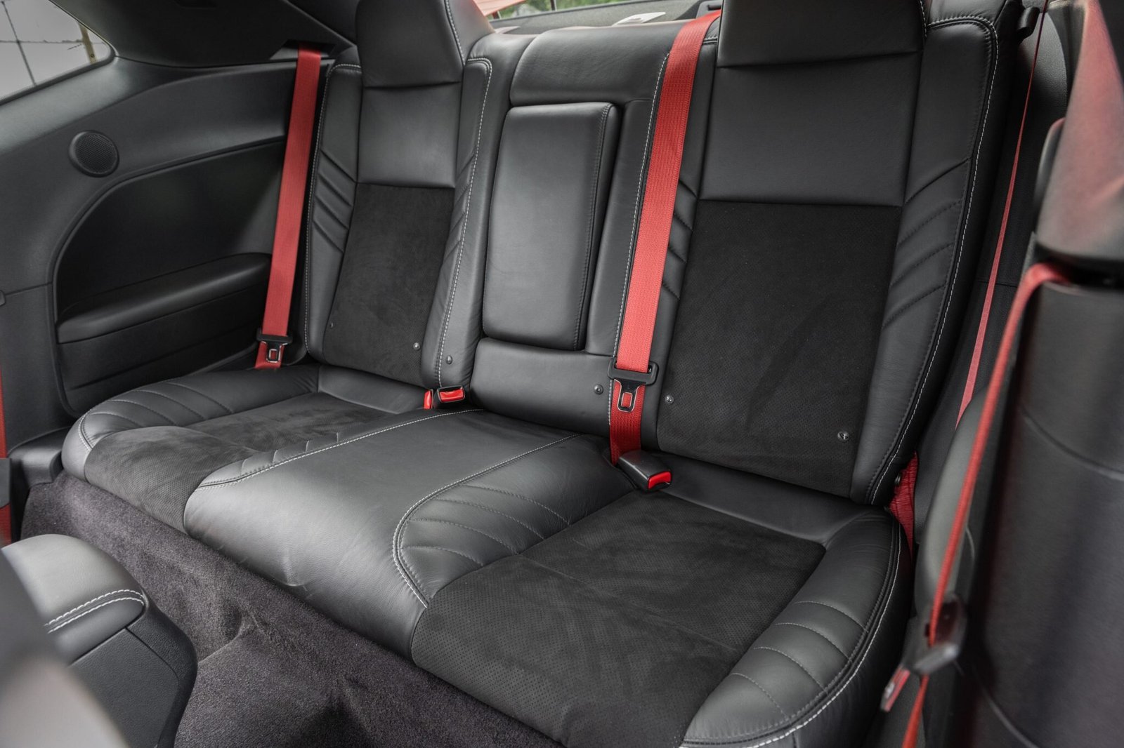 The cabin features black Laguna leather upholstery with white stitching and perforated Alcantara inserts, and this example was ordered with a passenger front seat and a 60/40-split folding rear bench.