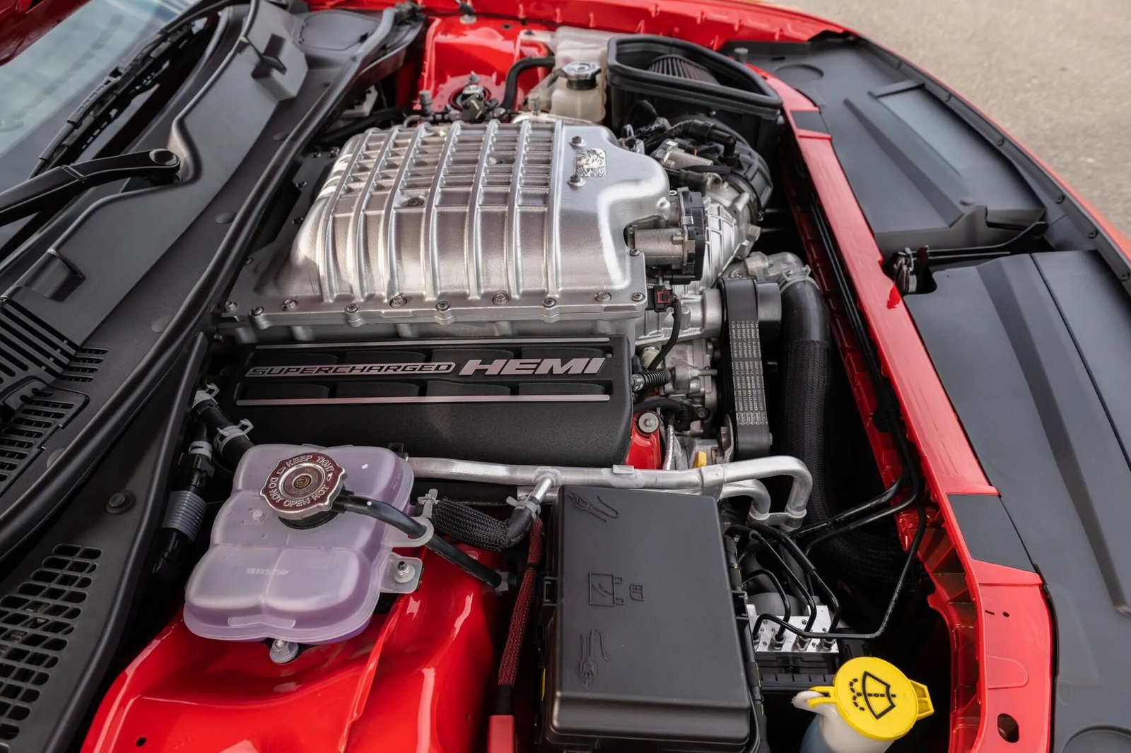 The 6.2-liter Hemi V8 features an IHI twin-screw driven supercharger and was factory rated at 808 horsepower and 717 lb-ft of torque on premium fuel, or up to 840 horsepower and 770 lb-ft of torque on 100-octane fuel when activated by the race-tuned ECU included in the Demon crate.