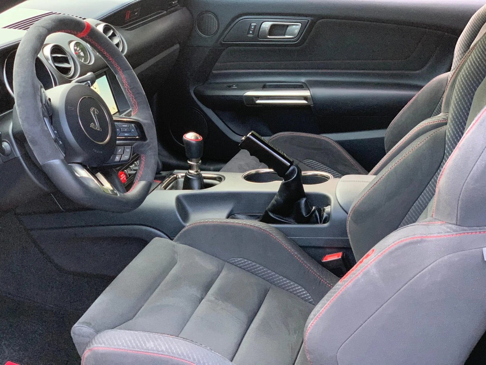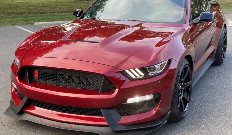 This 2018 Ford Mustang Shelby GT350R is powered by a 5.2-liter Voodoo V8 paired with a six-speed manual transmission and a Torsen limited-slip differential, and it is finished in Ruby Red Metallic over Ebony cloth and Miko suede. Equipment includes 19″ carbon-fiber seven-spoke wheels, Brembo brake calipers, a carbon-fiber wing, a voice-activated touchscreen with navigation, a Bang & Olufsen sound system, a rearview camera, and Recaro seats.