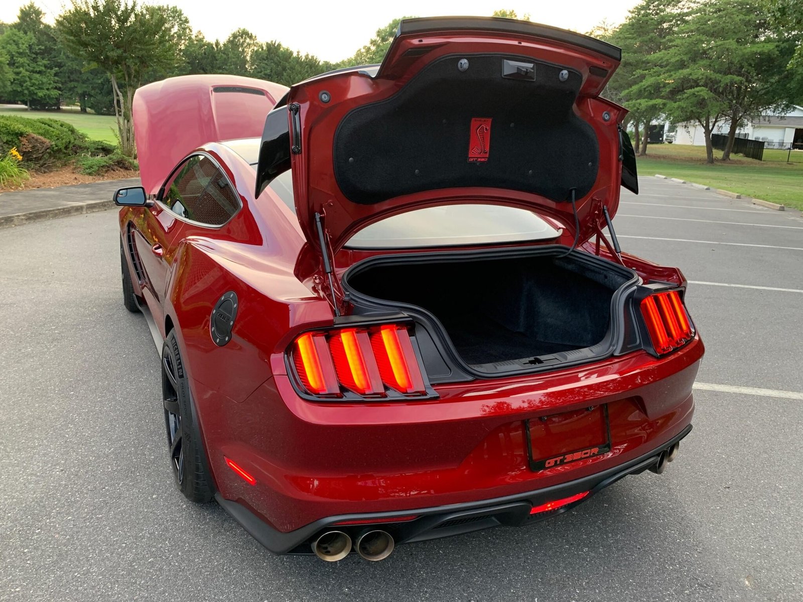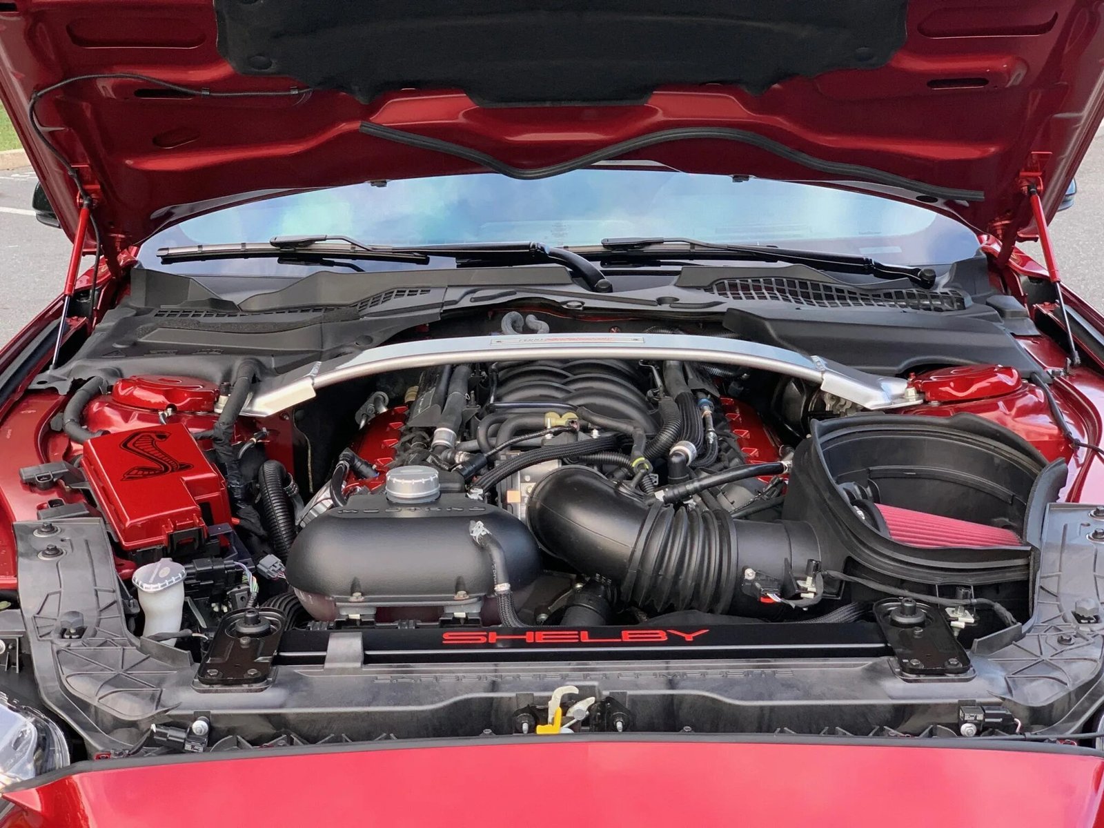 The car is finished in Ruby Red Metallic Tinted Clearcoat with an optional painted black roof and features HID projector headlights, a carbon-composite front grille, functional hood and fender vents, a front splitter with the Shelby logo, a carbon-fiber wing, LED taillights with sequential turn signals, and quad exhaust outlets.