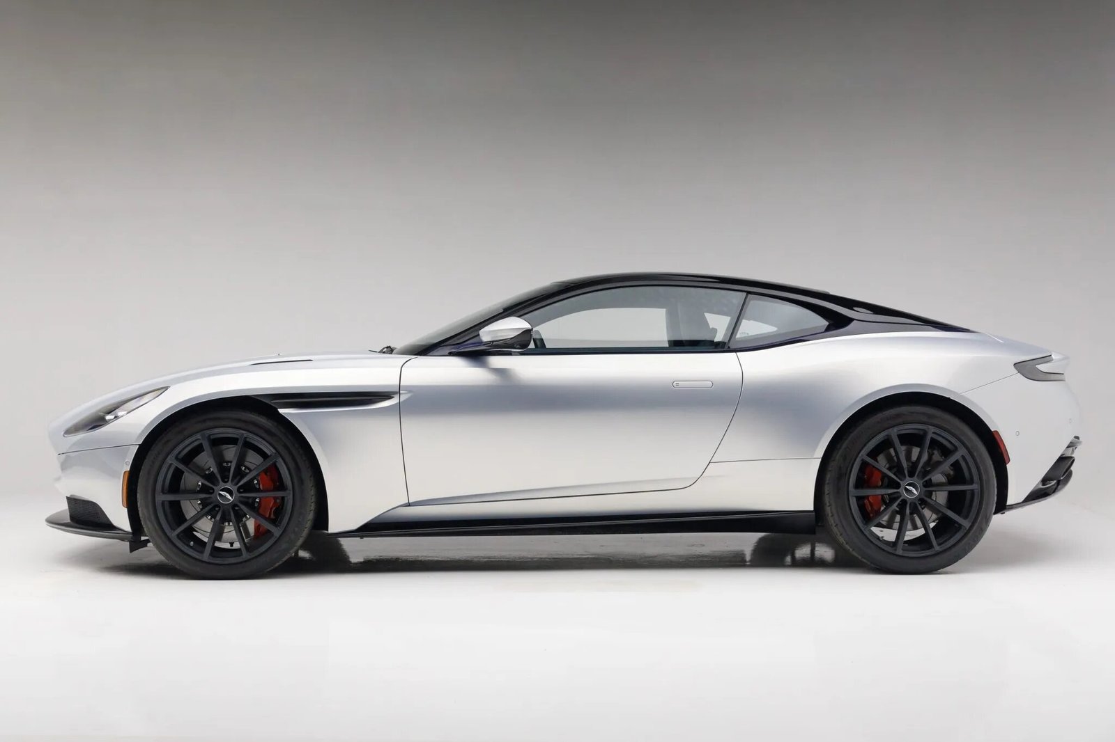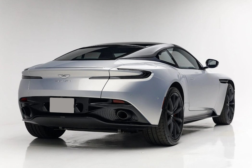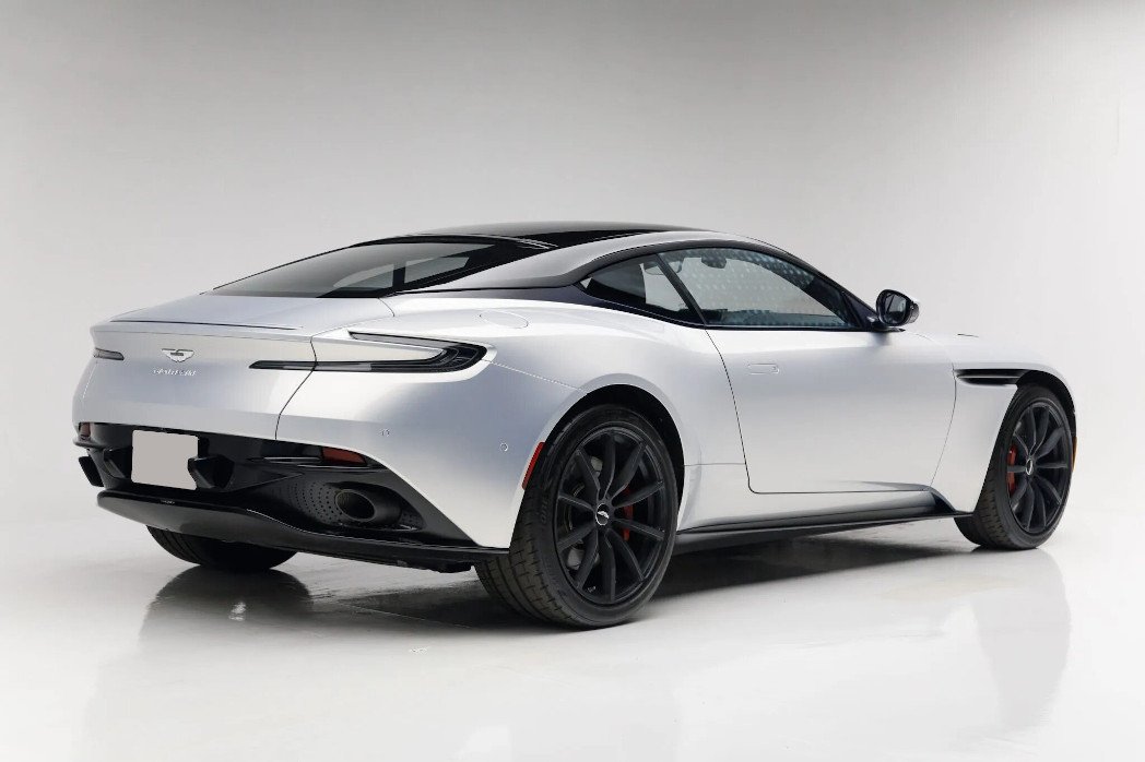 This 2019 Aston Martin DB11 AMR V12 is powered by a twin-turbocharged 5.2-liter V12 linked to a rear-mounted eight-speed automatic transaxle and a limited-slip differential, and the odometer indicates 3,700 miles. Finished in Lightning Silver over Dark Knight leather and Pure Black Alcantara upholstery, it is equipped with satin-black 20″ ten-spoke wheels, a deployable rear spoiler, selectable driver modes, active brake torque vectoring, red Aston Martin-branded brake calipers, heated and ventilated front seats, dual-zone automatic climate control, keyless entry, navigation, and touchpad-controlled infotainment.