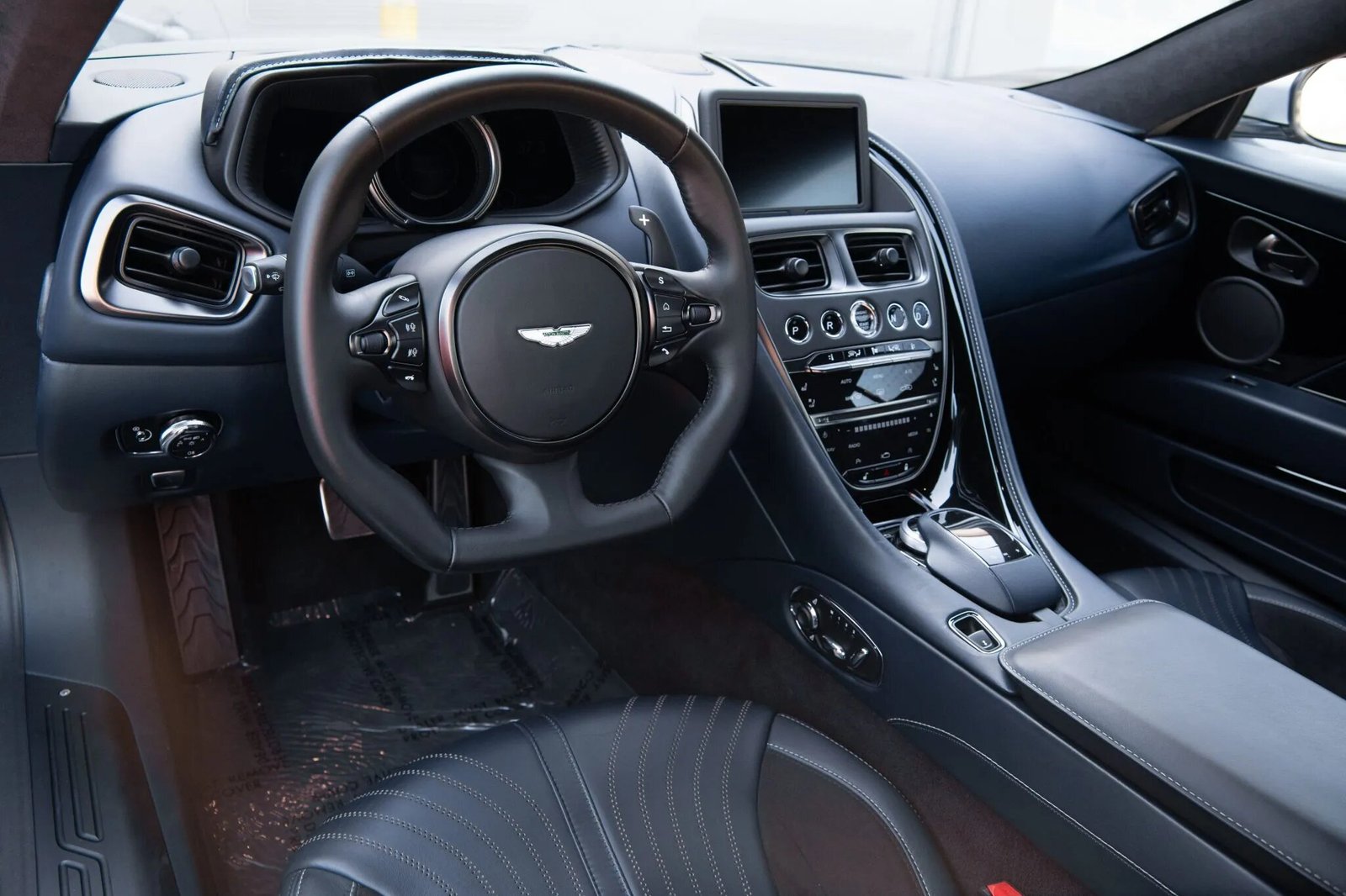 Satin-black-finished 20″ ten-spoke wheels wear 255/40 front and 295/35 rear Bridgestone Potenza S007 tires. The car features driver-selectable adaptive damping and is equipped with Dynamic Torque Vectoring, Dynamic Stability Control, and Positive Torque Control. Braking is handled by red-finished Aston Martin-logo calipers mounted over slotted rotors.