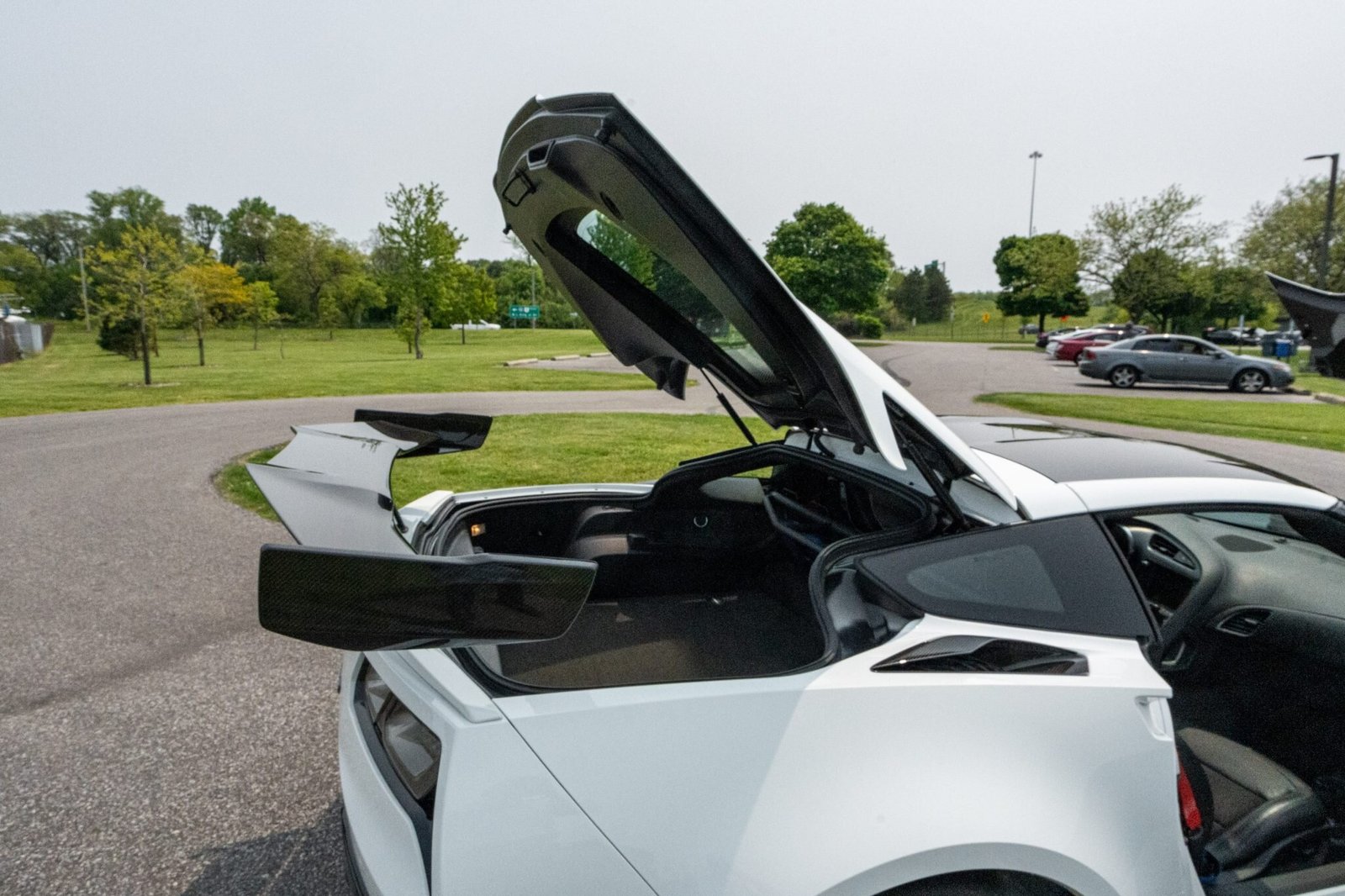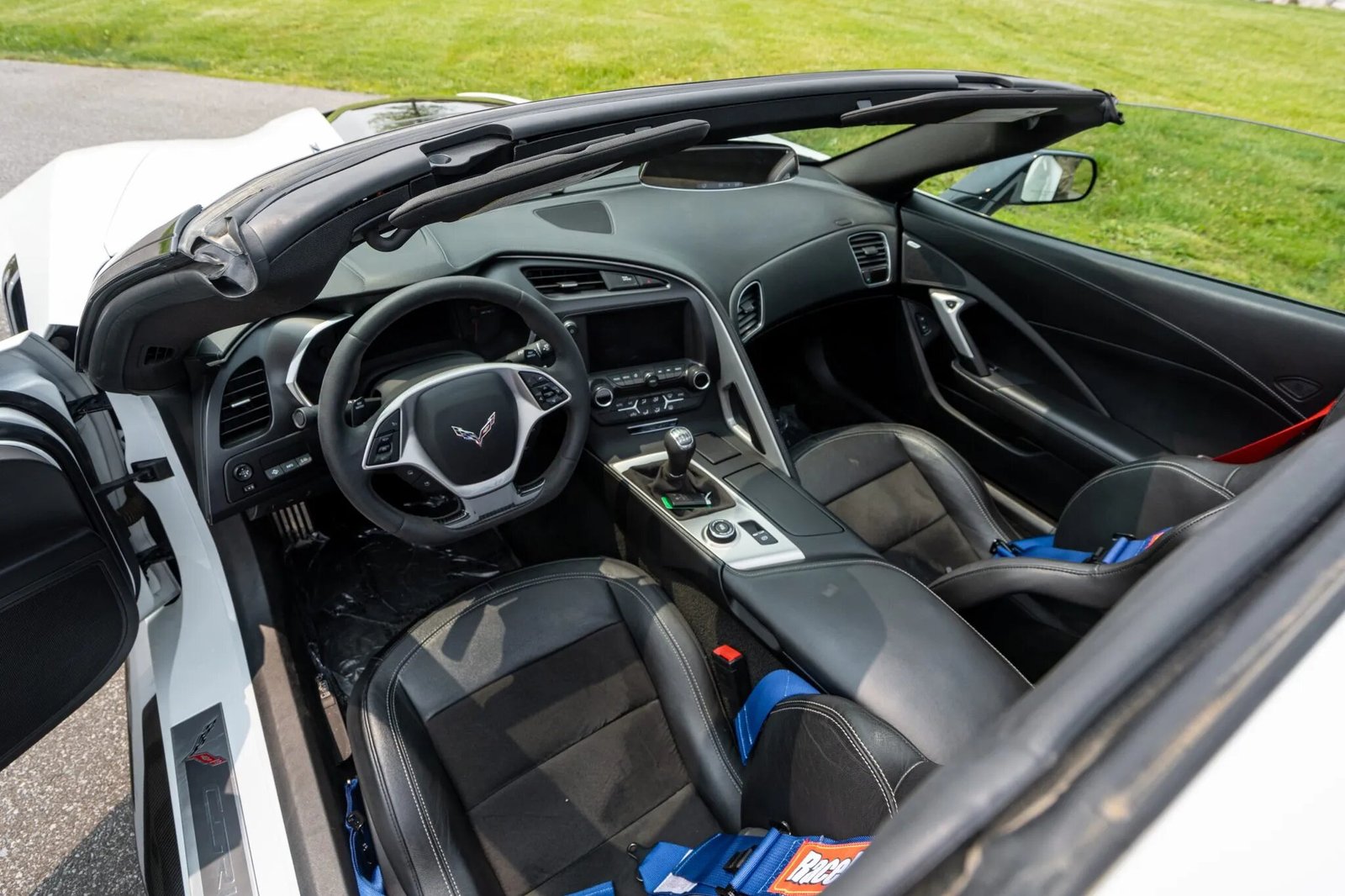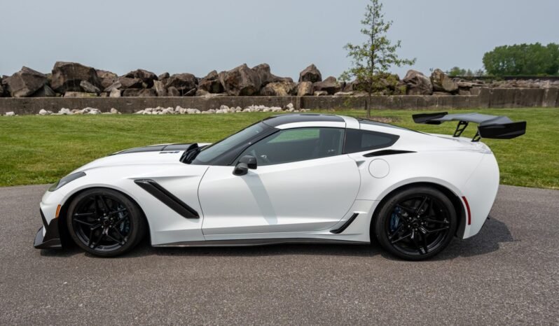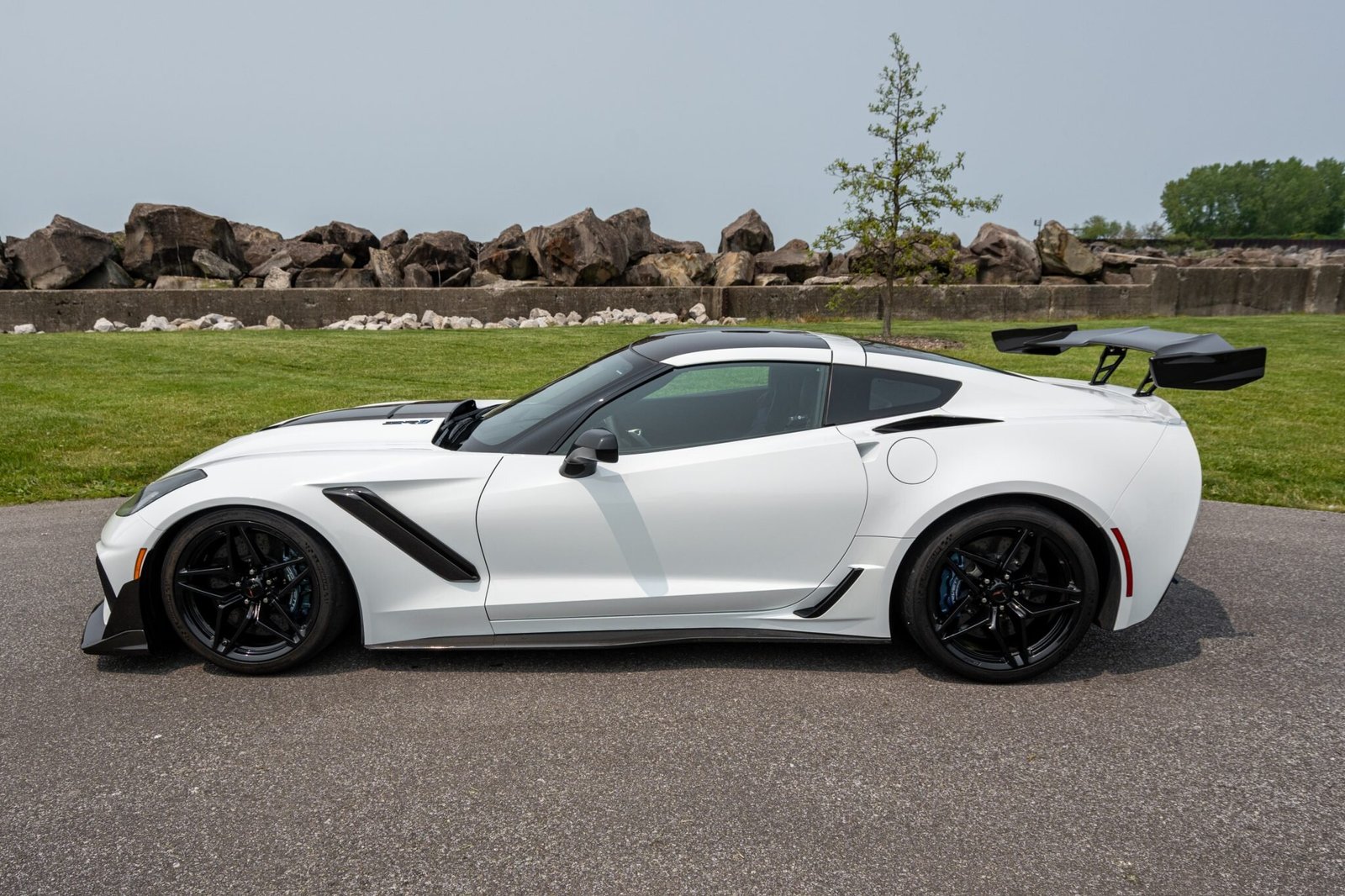 This Chevrolet Corvette ZR1 coupe is #21 of 38 Event Display vehicles built in 2019 and is powered by a supercharged 6.2-liter LT5 V8 linked with a seven-speed manual gearbox and an electronic limited-slip differential and is finished in Arctic White over black leather upholstery. Additional equipment includes the Track Performance Package, Carbon Flash 19″ and 20″ 10-spoke wheels, carbon-ceramic brakes, Magnetic Ride Control, a removable carbon-fiber roof panel, xenon headlights, a rear wing, Competition Sport bucket seats, a Brey-Krause harness bar, blue RaceQuip harnesses, a performance data and video recorder, a back-up camera, navigation, a head-up display, and a Bose sound system.