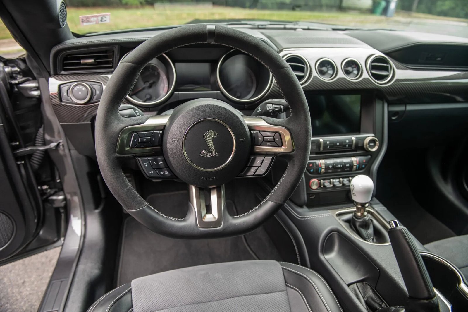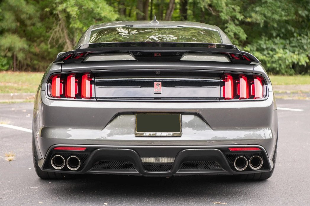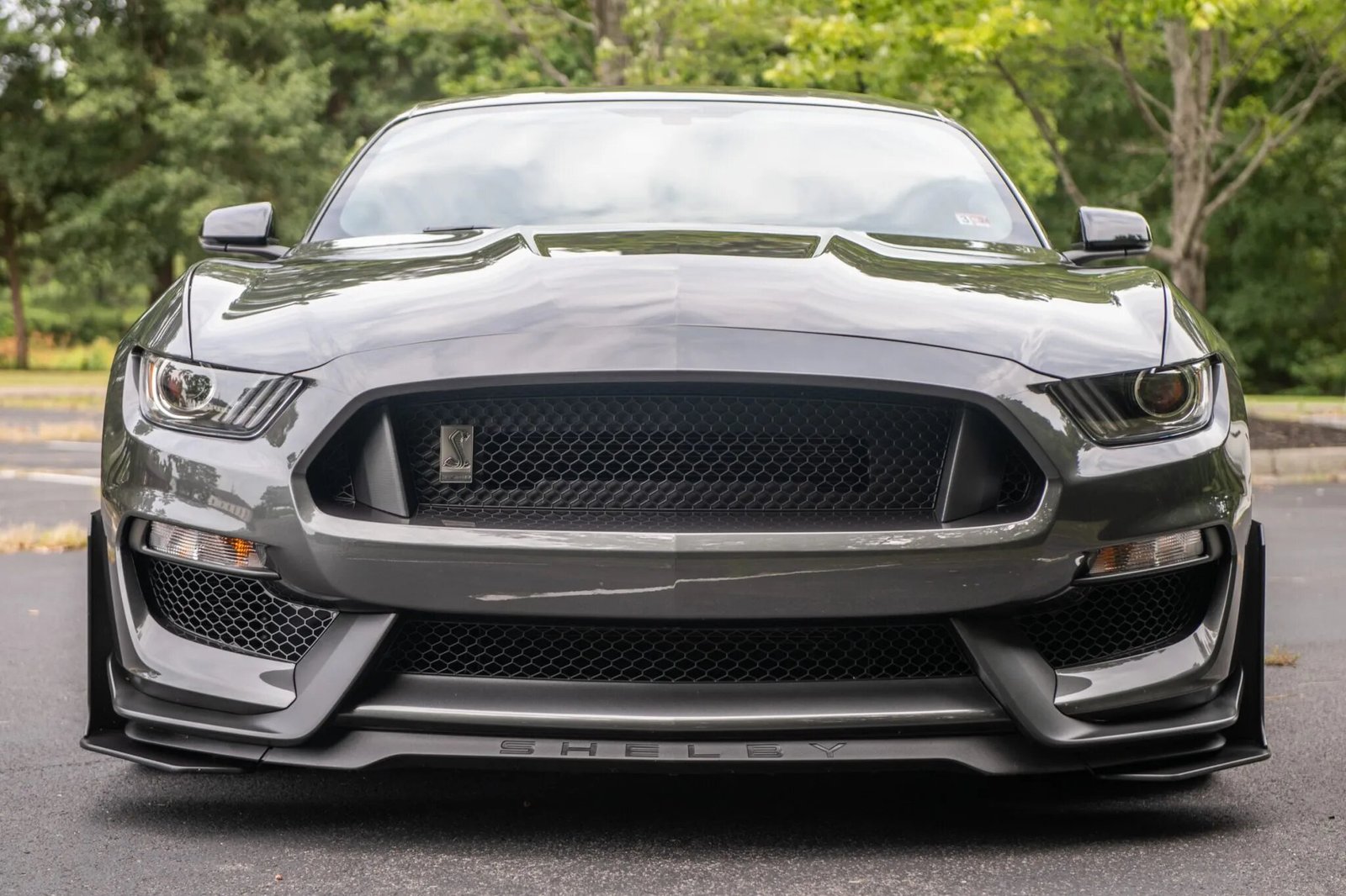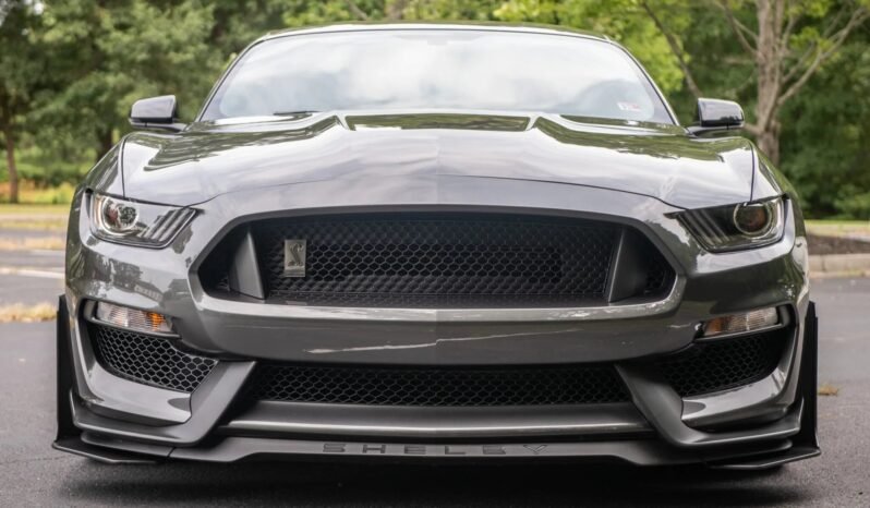 The car is finished in Magnetic Metallic, and features include functional hood and fender vents along with a front splitter with the Shelby logo, HID projector headlights, LED taillights with sequential turn signals, heated side mirrors, Cobra puddle lamps, and quad exhaust outlets. The Handing Pack adds a rear spoiler with a Gurney flap, and splitter wickers have been installed up front. Paint protection film is cover the front, side, and rear of the vehicle.