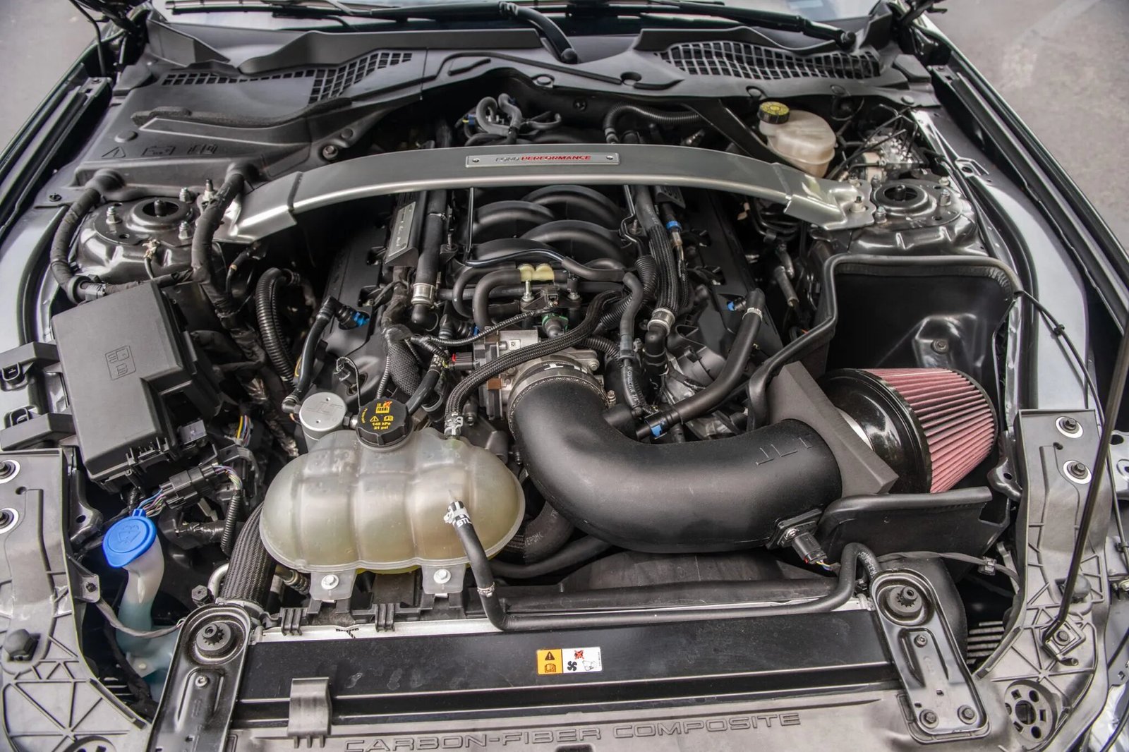 The 5.2-liter Voodoo V8 features a flat-plane crankshaft along with dual overhead camshafts, variable valve timing, and an engine oil cooler. A commemorative plaque displays the signature of the engine builder, and additional coolers for the engine, transmission, and differential were standard. A JLT air intake has been fitted, and the seller notes that the car is equipped with a performance tune courtesy of National Speed.
