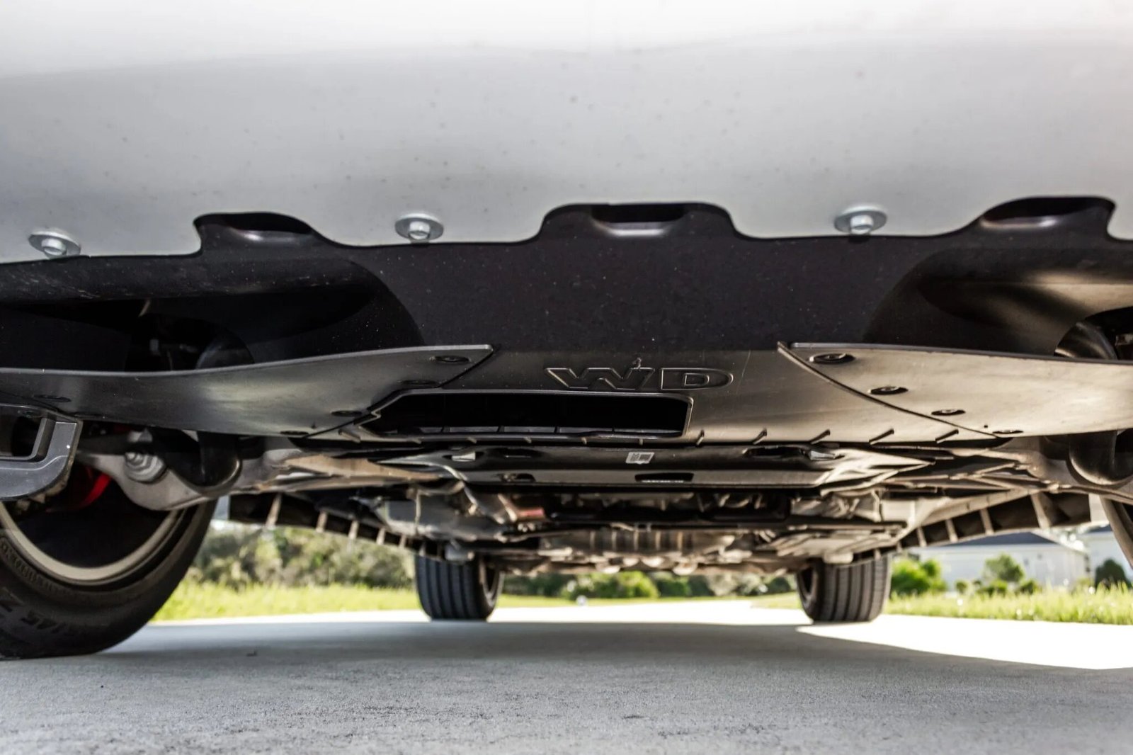 The cabin features seating surfaces trimmed in Demonic Red leather with contrasting black leather on the dashboard, center console, and door panels. All-weather Durango-branded floor mats line the footwells and cargo area. Other amenities include heated and ventilated power-adjustable front seats, heated second-row seats, a 19-speaker Harman-Kardon sound system, remote start, a wireless charging pad, illuminated rear cup holders, and Uconnect 5 navigation with a 10.1″ display and smartphone connectivity. Driving aids consist of the Technology Group, which added Advanced Brake Assist, Lane Departure Warning Plus, Forward Collision Warning Plus, and Adaptive Cruise Control. The truck was also optioned with blind spot and cross-path detection.