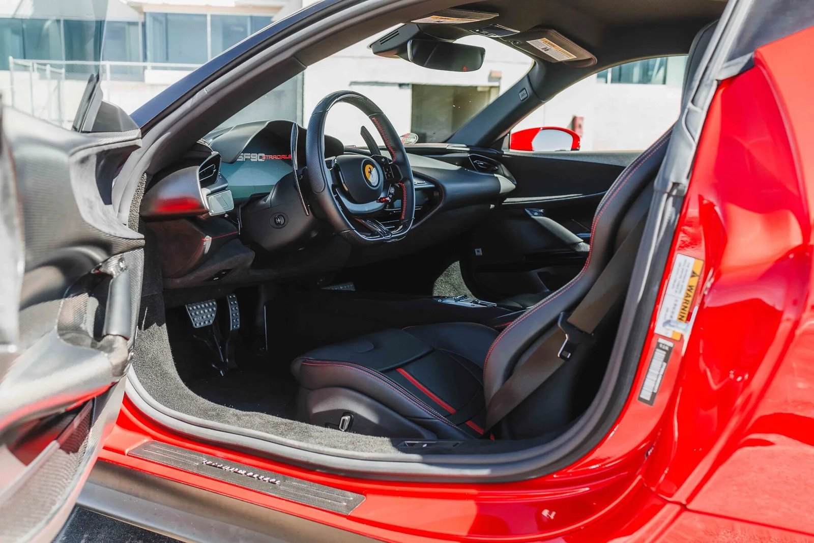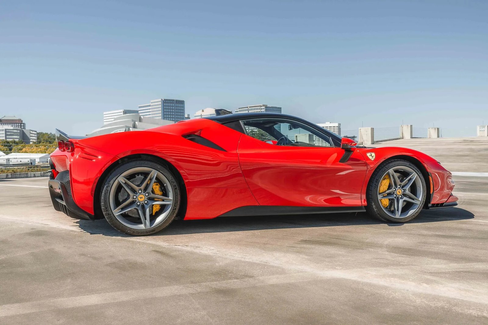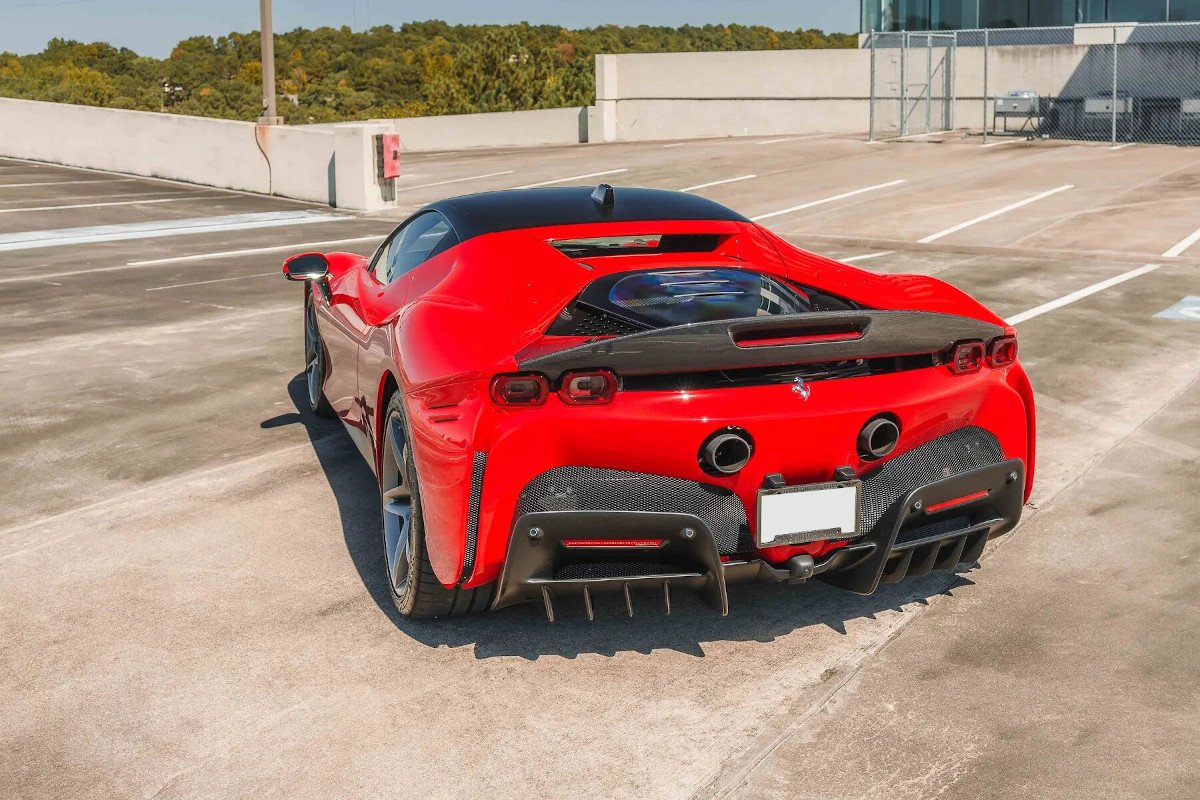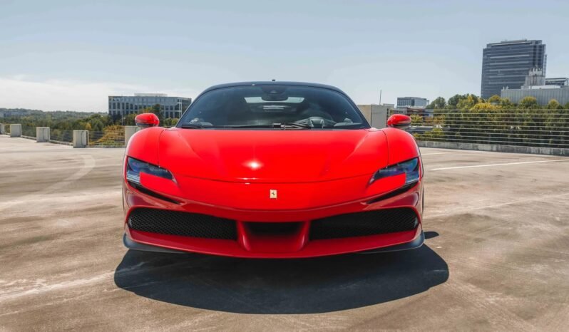 This 2021 Ferrari SF90 Stradale is finished in Rosso Corsa with a Nero roof over black leather upholstery, and power comes from a twin-turbocharged 4.0-liter V8 and a trio of electric motors that drive all four wheels via an eight-speed dual-clutch automatic transmission. The car was optioned with the Assetto Fiorano package, which added motorsport-derived Multimatic shocks, titanium springs, a titanium exhaust system, and carbon-fiber door and underbody panels for a weight savings of approximately 66 pounds. Additional features include a 7.9-kWh lithium-ion battery, a regenerative braking system with yellow-painted calipers over carbon-ceramic rotors, black ceramic exhaust pipes, enamel Scuderia Ferrari fender shields, an advanced front driving camera, full-electric seats, a JBL sound system, and carbon-fiber interior trim.