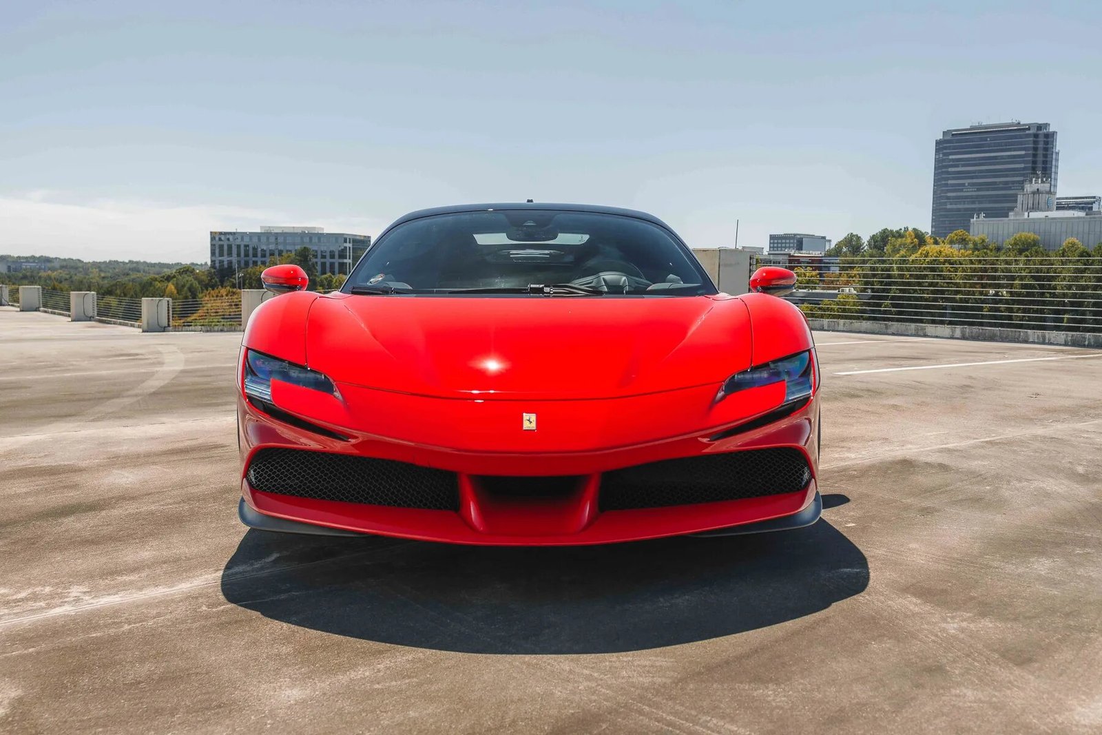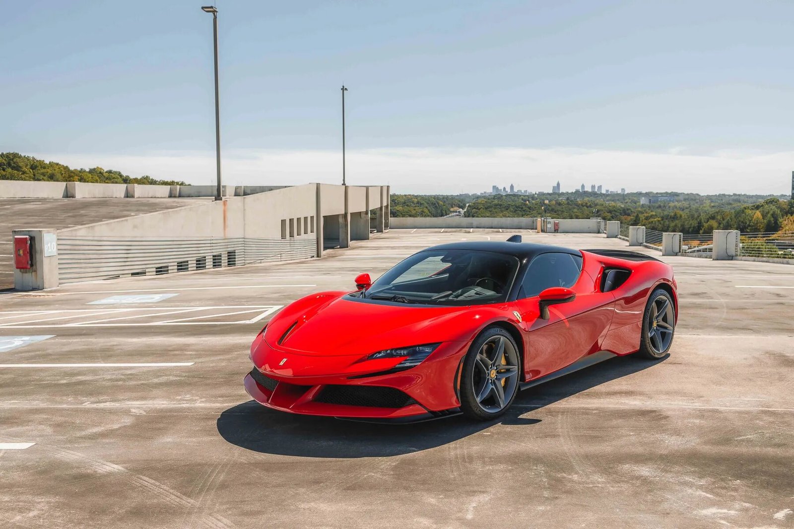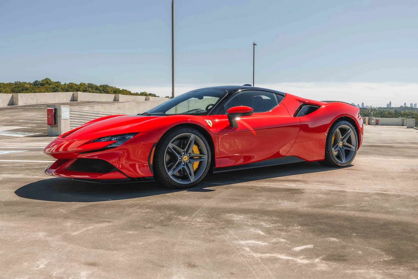 This 2021 Ferrari SF90 Stradale is finished in Rosso Corsa with a Nero roof over black leather upholstery, and power comes from a twin-turbocharged 4.0-liter V8 and a trio of electric motors that drive all four wheels via an eight-speed dual-clutch automatic transmission. The car was optioned with the Assetto Fiorano package, which added motorsport-derived Multimatic shocks, titanium springs, a titanium exhaust system, and carbon-fiber door and underbody panels for a weight savings of approximately 66 pounds. Additional features include a 7.9-kWh lithium-ion battery, a regenerative braking system with yellow-painted calipers over carbon-ceramic rotors, black ceramic exhaust pipes, enamel Scuderia Ferrari fender shields, an advanced front driving camera, full-electric seats, a JBL sound system, and carbon-fiber interior trim.