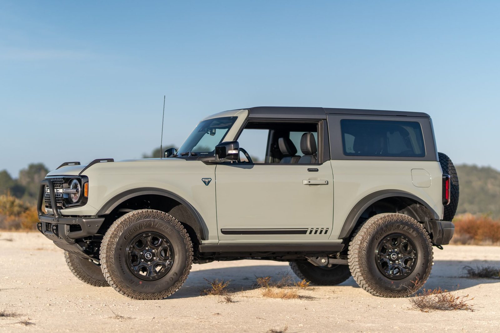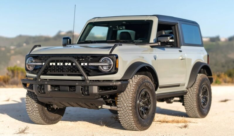 This Ford Bronco First Edition is a two-door example that is finished in Cactus Gray over black vinyl upholstery and is powered by a 2.7-liter Ecoboost V6 mated to a 10-speed automatic transmission, a dual-range transfer case, and electronic locking front and rear differentials. The truck is equipped with removable roof panels, a modular steel front bumper, keyless entry, the tow package, Ford Co-Pilot360, SYNC 4 infotainment, and the Sasquatch package, which adds 17″ beadlock wheels, Bilstein monotube shocks, skid plates, and high-clearance fender flares.