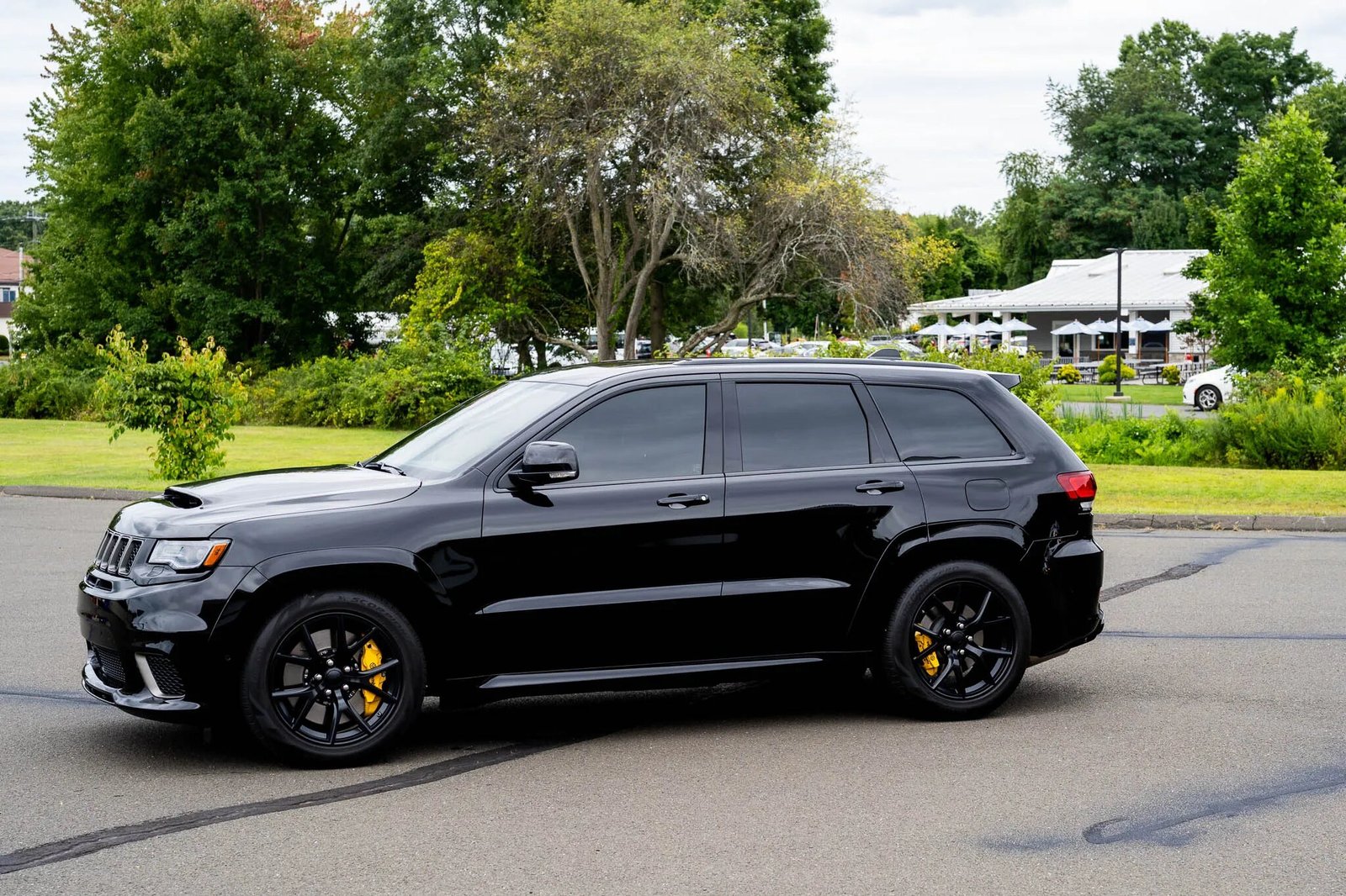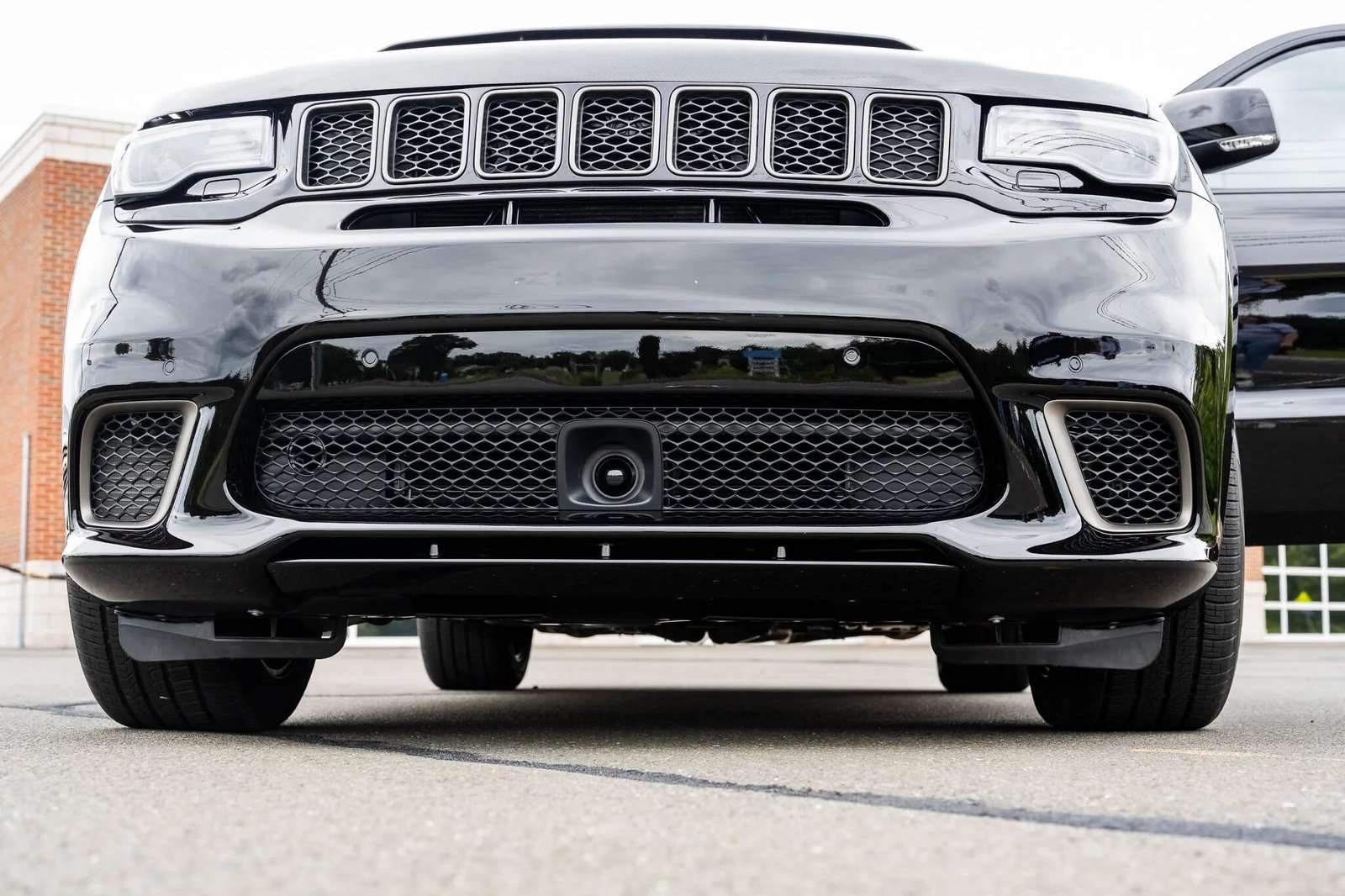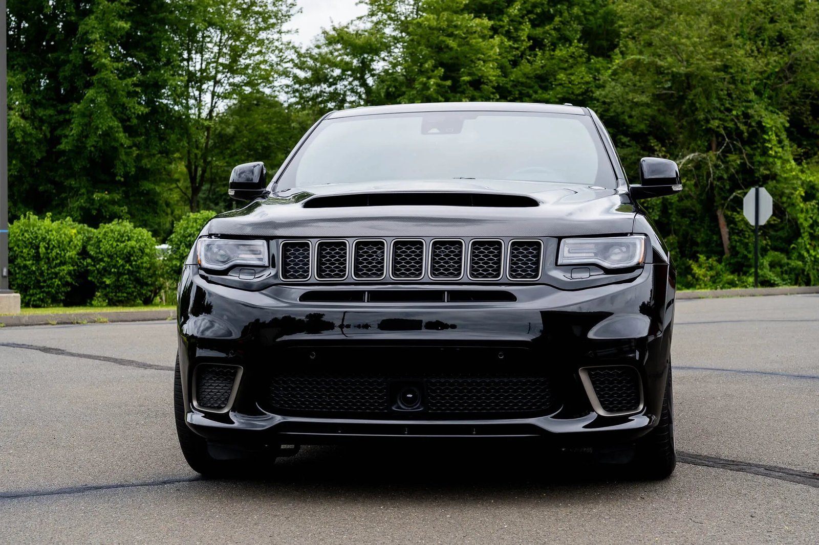 The Grand Cherokee Trackhawk features a front bumper cover with cooling ducts along with body-color fender extensions. This example is finished in Diamond Black Crystal Pearlcoat (PXJ), and additional exterior details include a dual-pane sunroof, a rear spoiler, tinted windows, rain-sensing windshield wipers, bi-xenon headlights, LED taillights, and quadruple exhaust outlets. A Black Ops Auto Works carbon-fiber hood, paint-protection film, and ceramic coating have been added.