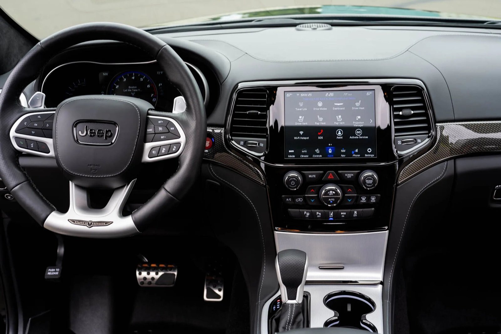 Trackhawk-branded heated and ventilated front seats are trimmed in black Laguna leather, and carbon-fiber trim accents the dashboard and door panels. Appointments include a remote-start system, red seatbelts, automatic climate control, adaptive cruise control, parking assist, Selec-Track with launch control, “Supercharged” sill plates, a universal garage-door opener, and a 19-speaker Harman Kardon sound system linked to Uconnect 4C infotainment with navigation and 4G WiFi hotspot, satellite radio, and Apple CarPlay and Google Android Auto capability.