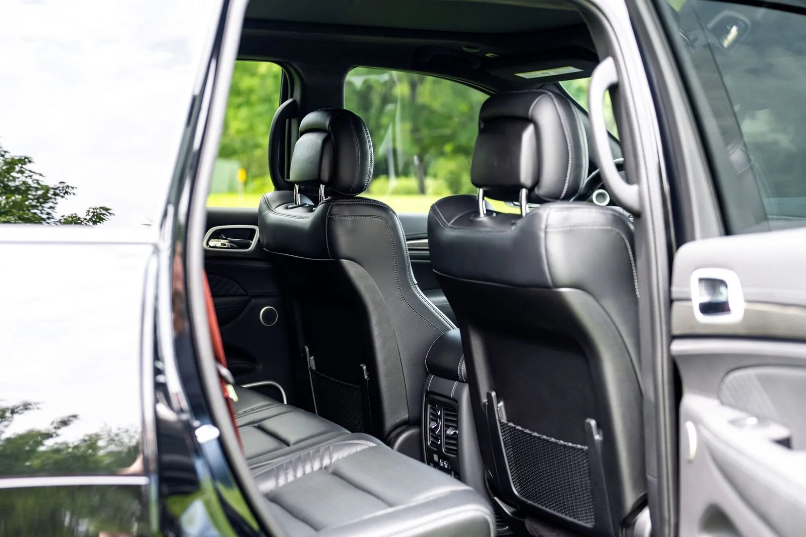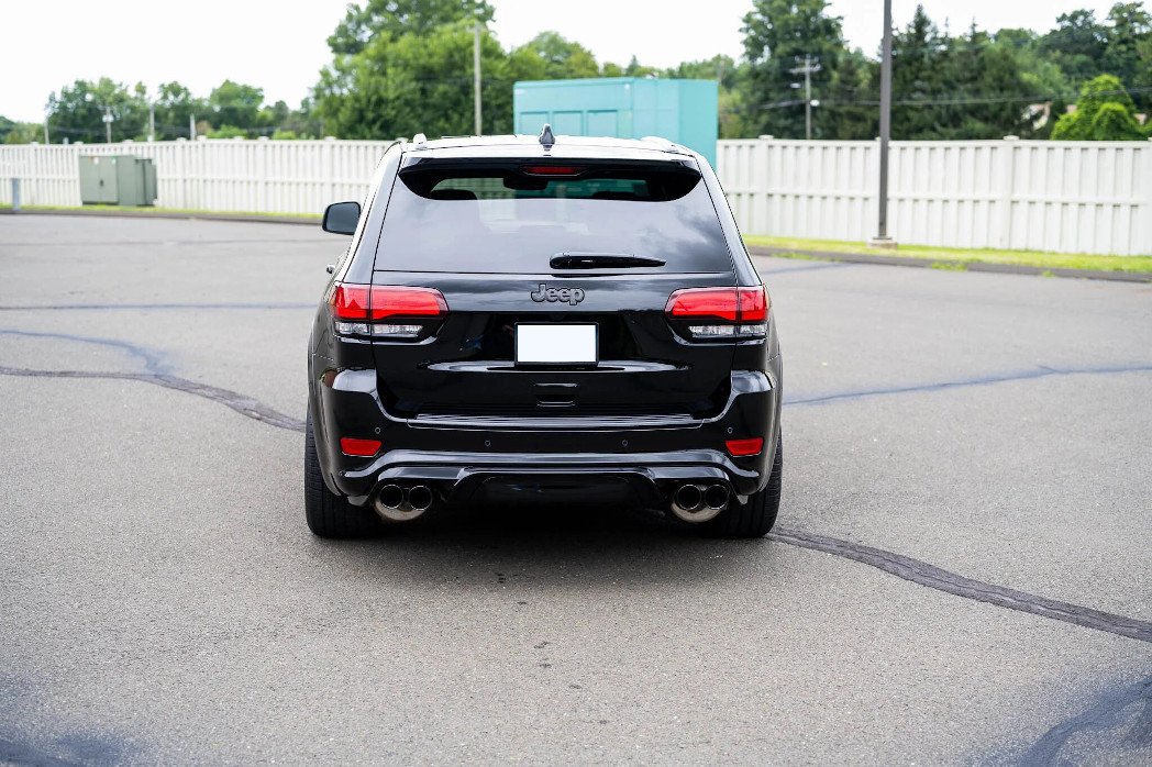This 2021 Jeep Grand Cherokee Trackhawk was purchased new by the seller and is finished in Diamond Black over black Laguna leather upholstery. Power is supplied by a 6.2-liter V8 linked to an eight-speed automatic transmission, a Quadra-Trac four-wheel-drive system, and an electronic limited-slip rear differential. A Dodge Challenger SRT Demon–style supercharger tuned by Livernois Motorsports & Engineering has been installed, and other modifications include a Black Ops Auto Works carbon-fiber hood, an aFe Power Track Series cold-air intake, a Forced Induction Interchillers blower spacer and thermal blanket, a J&L 3.0 oil separator, paint-protection film, ceramic coating, Eibach springs, an AWE Tuning exhaust system, a BWoody Performance suspension package, and BWoody Performance front and rear differential braces. Additional equipment includes adaptive cruise control, 20″ wheels, Brembo brakes, bi-xenon headlights, heated and ventilated front seats, heated rear seats, and a Uconnect infotainment system teamed with a 19-speaker Harman Kardon audio system.