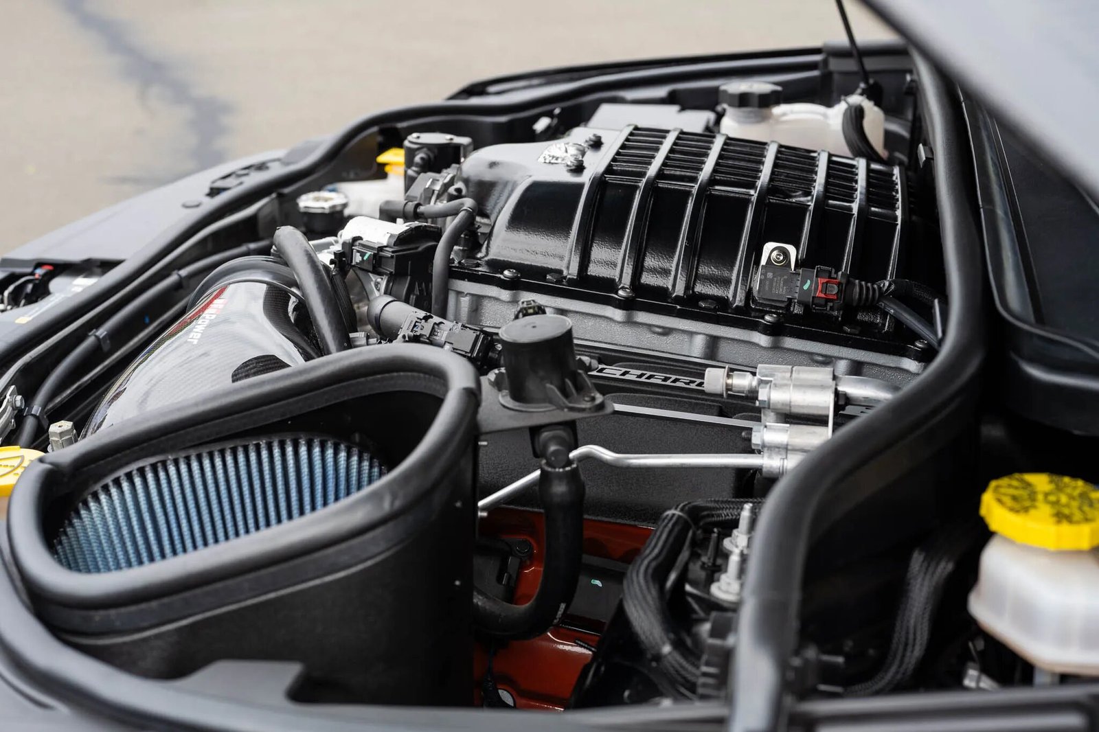 The 6.2-liter Hemi V8 has been fitted with a replacement Dodge Challenger SRT Demon–style supercharger that was sourced from Livernois Motorsports & Engineering and is reportedly rated to enable an estimated 1,200 horsepower using E85 gasoline. Other modifications include an aFe Power Track Series cold-air intake, Forced Induction Interchillers spacer plates and thermal blanket, and a J&L 3.0 oil separator. The oil was changed in preparation for sale.