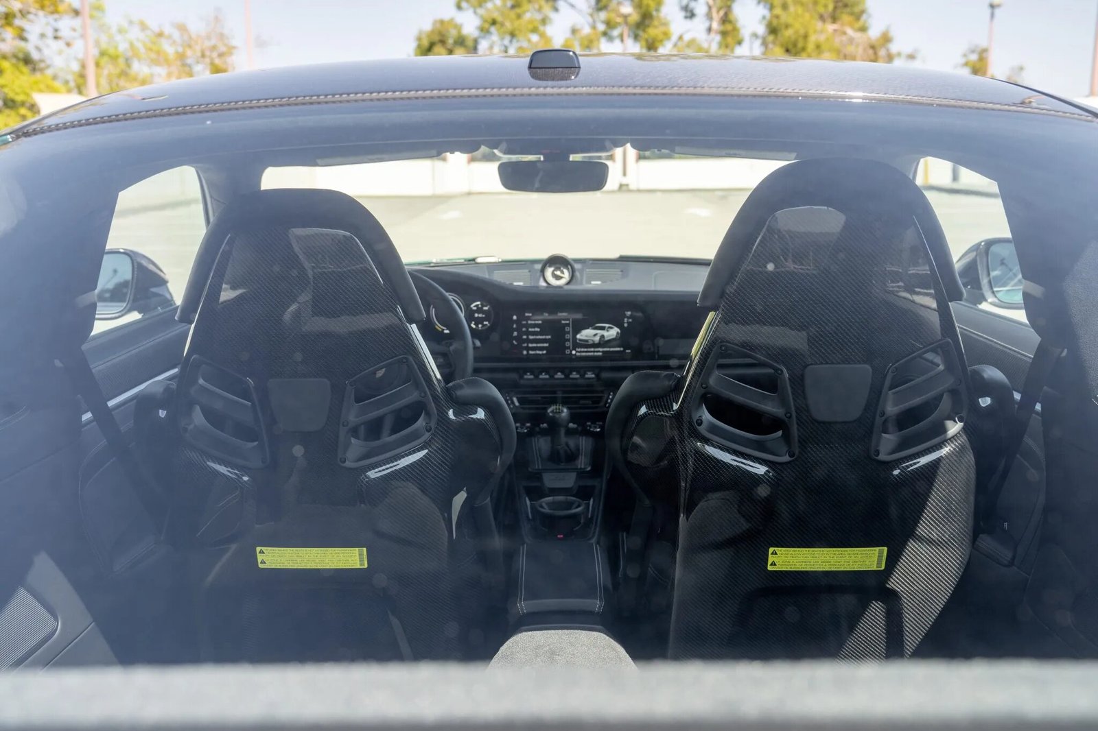 The cockpit features carbon-fiber full bucket seats upholstered in black leather with cloth inserts and contrasting deviated stitching that extends to the dashboard, door panels, gear selector, knee pad, and steering wheel. Amenities include the Chrono package, carbon-fiber trim, traffic sign recognition, a Bose audio system, ambient lighting, aluminum pedals, auto-dimming mirrors, a Race-Tex headliner, and Porsche Communication Management with navigation.