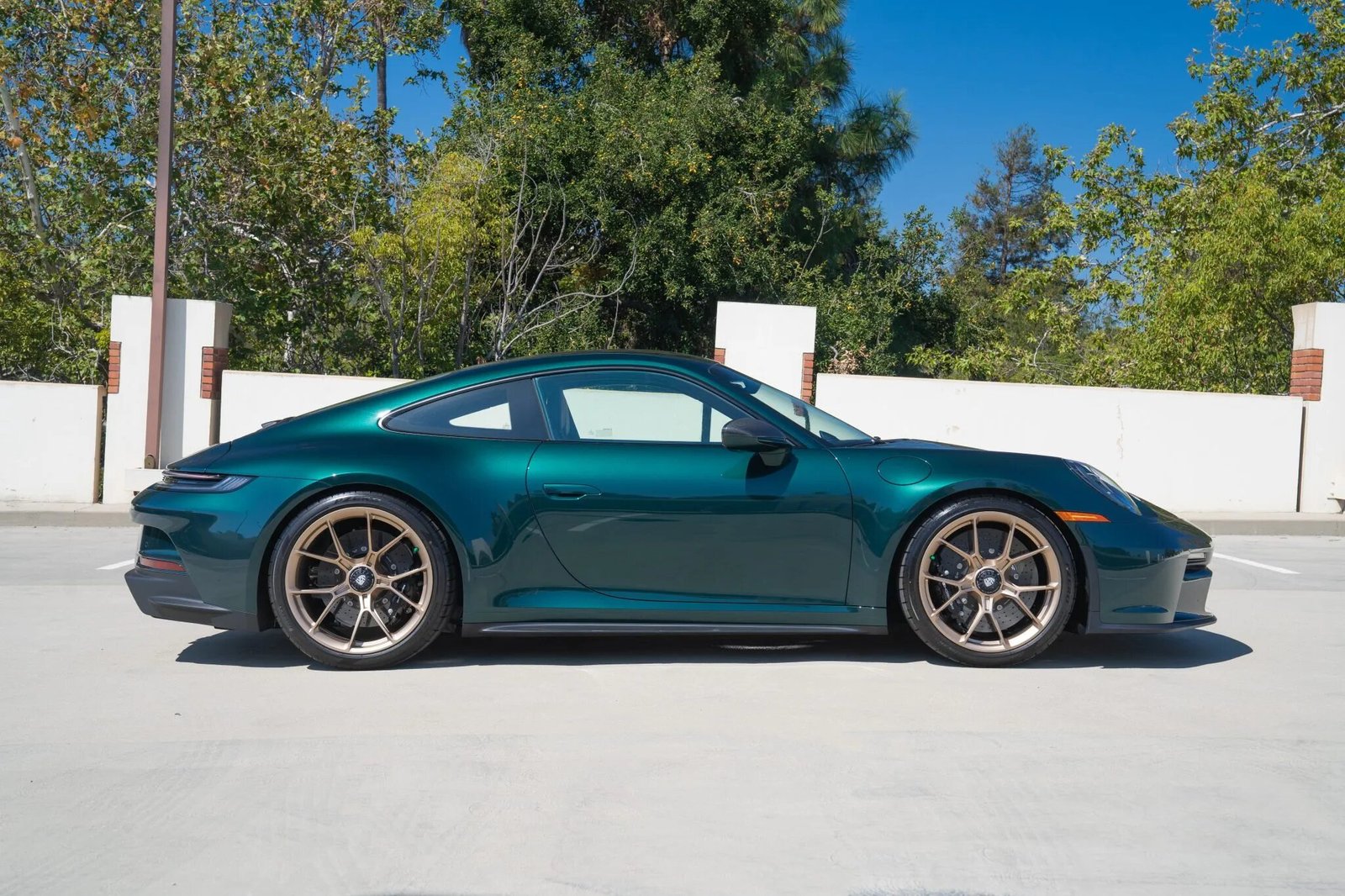 This 2022 Porsche 911 GT3 Touring is finished in paint-to-sample Jet Green Metallic over black leather and cloth upholstery and is powered by a 4.0-liter flat-six mated to a six-speed manual transaxle and a limited-slip differential. Equipment includes 20″ and 21″ Satin Neodyme-finished center-lock wheels, Porsche Ceramic Composite Brakes (PCCB), a front-axle lift system, LED-Matrix Design headlights with Porsche Dynamic Light System Plus (PDLS+) in addition to Exclusive Design taillights, a carbon-fiber roof panel, an extended-range fuel tank, the Chrono Package, rear ParkAssist, a Bose audio system, and carbon-fiber full bucket seats.