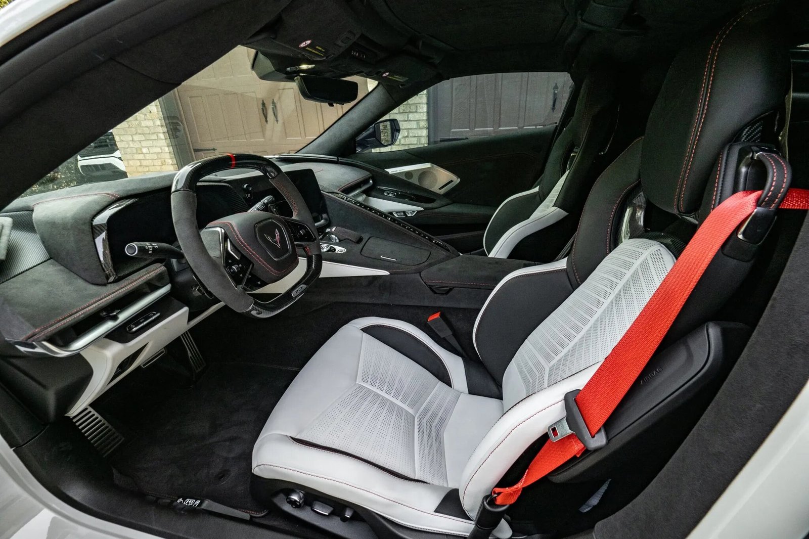 The heated, ventilated, and power-adjustable GT2 bucket seats are trimmed in Ceramic White leather with black accents and red stitching, accompanied by a color-coordinated dashboard, door panels, and carpets. Carbon-fiber trim accents the cabin, and additional appointments include Torch Red seatbelts, a head-up display, dual-zone automatic climate control, a rear-camera mirror, remote start, carpeted floor mats, a performance data recorder, a 14-speaker Bose sound system, and an 8″ color touchscreen with Chevrolet Infotainment 3.