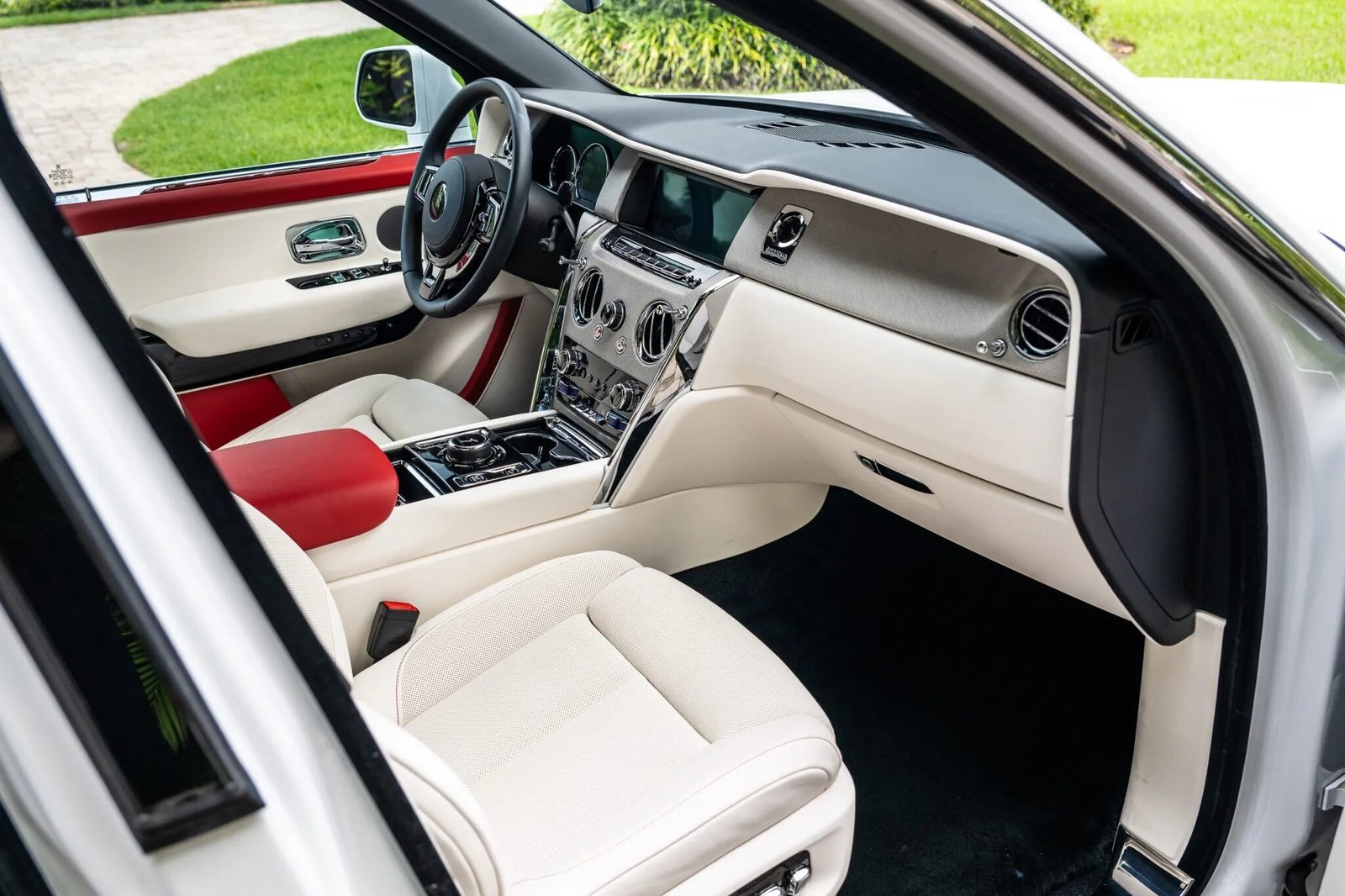 This 2023 Rolls-Royce Cullinan it is finished in Arctic White and powered by a twin-turbocharged 6.75-liter V12 linked with an eight-speed automatic transmission and an all-wheel drive system. On the inside, the heated, ventilated, and massaging front seats and heated rear seats are trimmed in Grace White leather with Phoenix Red trim and are accompanied by a Shooting Star headliner, illuminated treadplates, and lambswool floor mats. Additional details include polished 22″ wheels, self-leveling air suspension, rear-hinged rear doors, laser headlights, and the Driver Assistance Systems package.