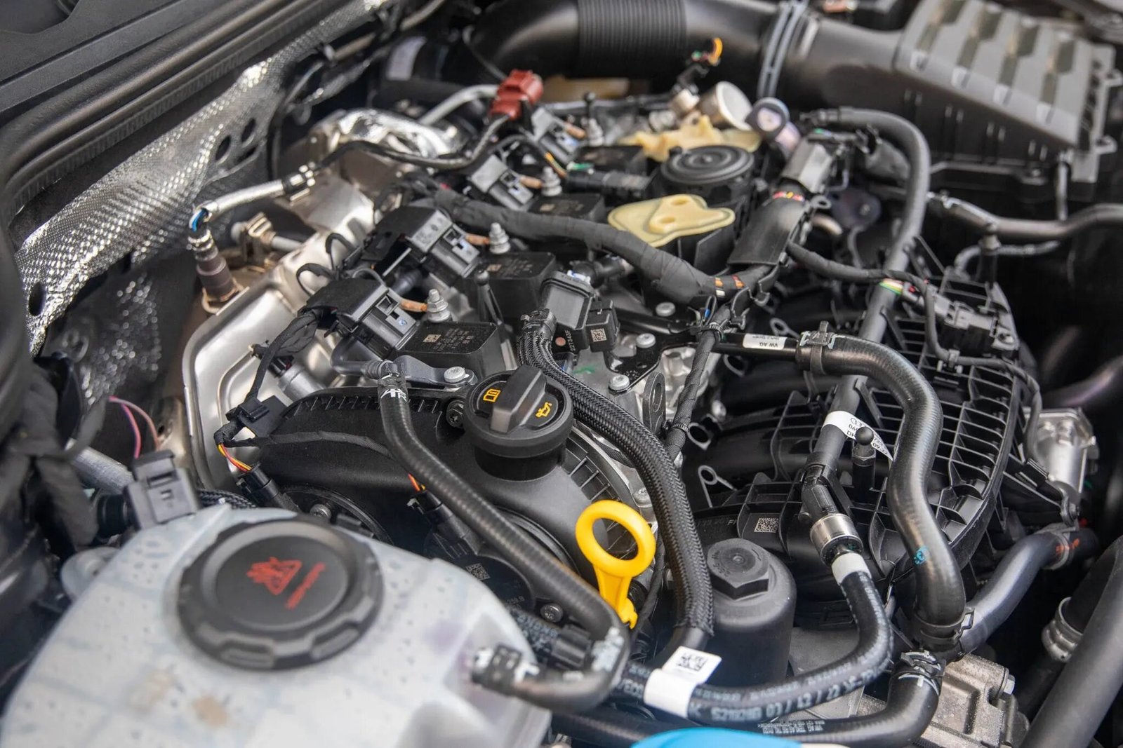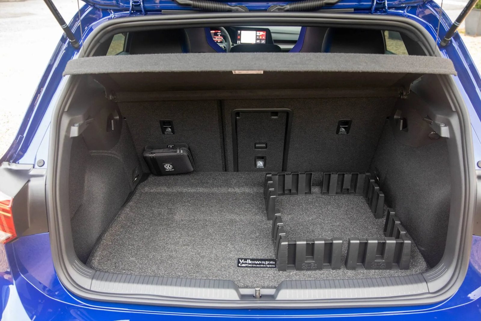 The cabin features seating surfaces upholstered in Titan Black leather with contrasting piping, and embroidered R emblems accent the backrests of the heated and ventilated front bucket seats. Carbon-fiber trim accents the dashboard and door panels, and appointments include a power-adjustable driver’s seat, three-zone automatic climate control, heated rear seats, keyless entry, ambient lighting, a head-up display, selectable driving modes, and Harman Kardon Premium Audio linked to a 10″ infotainment system with navigation, VW AppConnect smartphone integration, satellite radio, and Bluetooth connectivity. Driver-assistance systems comprise active blind-spot monitoring, lane-keeping assist, and adaptive cruise control with forward collision warning and autonomous emergency braking.